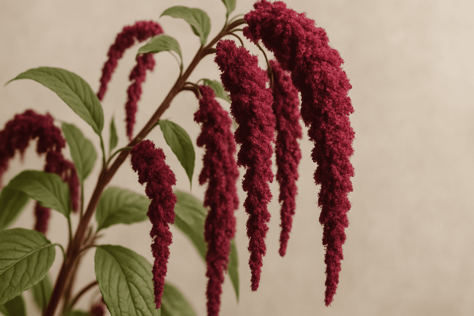 Amaranthus – auch als Fuchsschwanz bekannt – ist pure Dramatik in Pflanzenform. Lange, hängende Blütenrispen fallen in üppigen Strängen über den Rand von Vasen oder Kränzen und bringen eine fast barocke Fülle in jedes Arrangement. Die Farbe reicht von tiefem Bordeauxrot über Rosa bis hin zu Grüntönen.