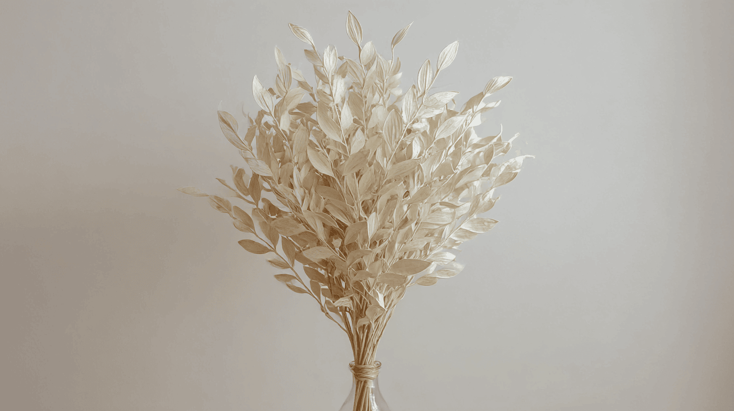 Konservierter Ruscus bleibt weich und flexibel – ganz ohne Wasser. Einfach trocken lagern, nicht pressen, vor Sonnenlicht schützen. Bleichtes Ruscus kann etwas empfindlicher sein – am besten nur leicht mit einem Pinsel abstauben.