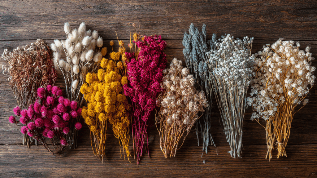 - 3–5 Sorten Trockenblumen (Volumengeber, Füller, Akzente, Gräser)