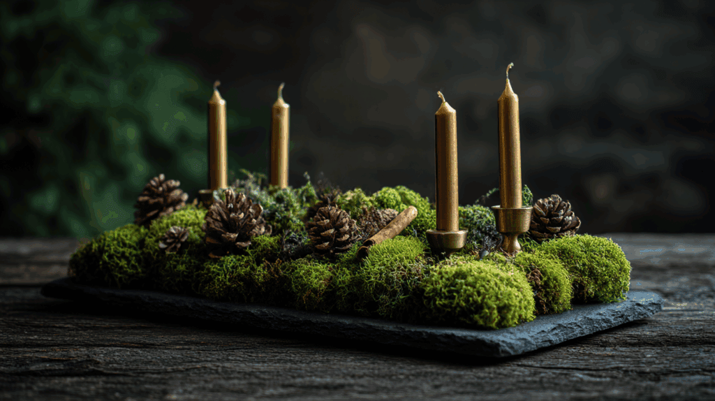 - Modern dekorieren: Z. B. zwei Drittel „pures Moos“, ein Drittel mit Filzband, Zapfen und zarten Trockenblumen – oder eine leichte Silberblatt-Girlande.
