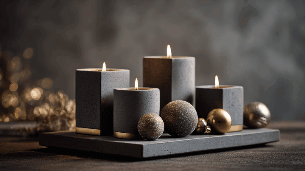 Vier gegossene Betonkerzenhalter (aus Joghurtbechern oder Silikonformen) auf einem Tablett oder einer Schieferplatte arrangieren. Beton wirkt kühl und modern, Akzente in Gold oder Kupfer bringen Wärme ins Spiel.