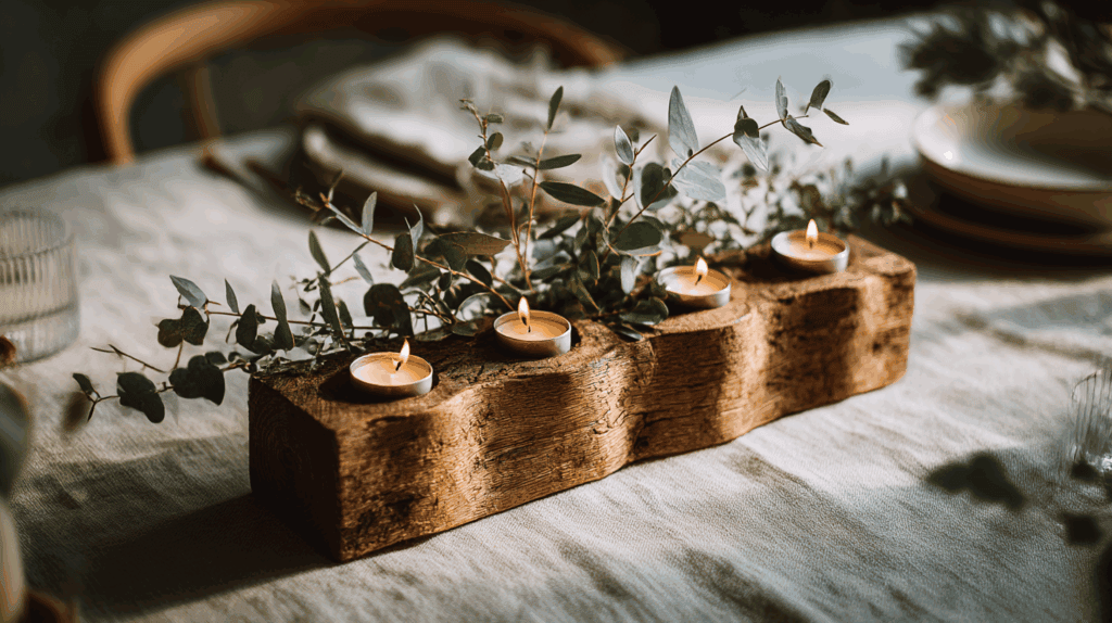 - Natürlich & warm: Holztablett oder Baumscheibe.