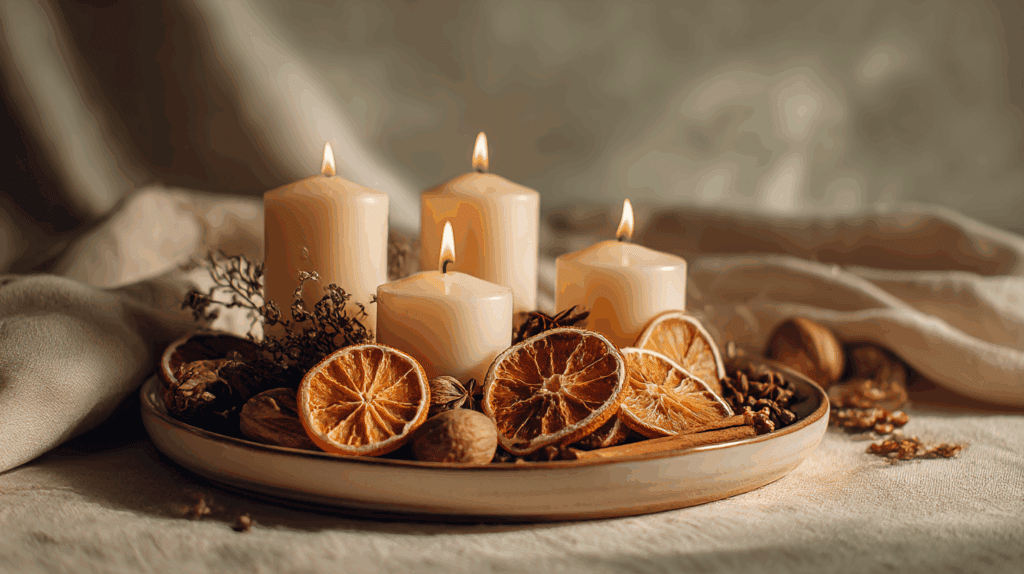 Der „Styled-Vignette“-Trend macht den Adventskranz zum Mini-Interior-Projekt. Statt zu binden, komponierst du – auf einem Tablett, Teller oder einer Kiste. So entsteht ein flexibles, wandelbares Stillleben, das sich deinem Zuhause anpasst.