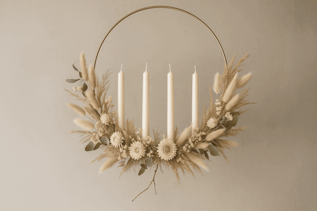 Der Adventskranz wird Teil deines Interieurs. Minimalistische Ringe in Schwarz, warme Holzleisten im Scandi-Look, Boho-Arrangements mit Trockenblumen oder urbane Akzente mit Beton und Glas: Du wählst das Material, das deinen Raum ergänzt – nicht dominiert.
