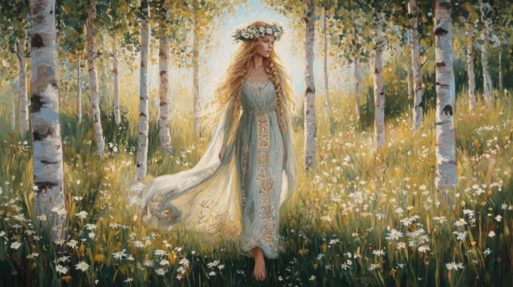 Wenn Yggdrasil die Statik bildet, ist Freya die Dynamik – blühend, fruchtbar, magisch. Ihr „Feld“ ist kein Palast, sondern eine Wiese. Unter der Linde wird Gericht gemildert, unter der Birke der Frühling begrüßt. Wiesenblumen – von Wildrose über Frauenmantel bis Schlüsselblume – tragen Freyas Handschrift: Liebe, Heilung, Schutz. Besonders stark leuchtet Johanniskraut. Sein roter Saft wurde als heiliges Blut gedeutet – konzentrierte Lebenskraft, die du zu Sonnenwende sammelst. Genau diese Blumen sind es, aus denen später Kränze geflochten werden, die nicht nur schön sind, sondern wirken sollen.