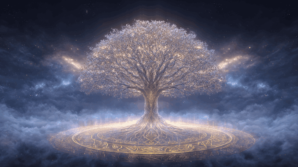 Im Zentrum der Welt steht ein Baum. Yggdrasil spannt seine Äste über alle Sphären und verbindet Himmel, Menschenwelt und Unterwelt. Er ist Maßstab, Verkehrsnetz und Heiligtum in einem – so zentral, dass selbst göttliches Wissen an ihm errungen wird. Ob Esche oder Eibe: Entscheidend ist sein Prinzip. Yggdrasil macht vor, was der Kranz später wiederholt: Ein organisches Gebilde hält die Ordnung, ohne Anfang, ohne Ende. Kreisdenken in Baumgestalt.