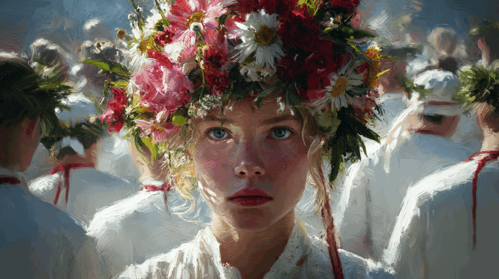 Als Ari Asters Film Midsommar erschien, bekam der Blumenkranz ein neues, globales Gesicht – und einen düsteren Beigeschmack. Die weißgekleideten Figuren, die Tänze, die Runen – vieles im Film basiert auf echten Bräuchen. Doch Aster drehte die Symbolik um: Aus dem Fest des Lebens wurde eine Geschichte über Verlust, Kontrolle und Wiedergeburt in Angstfarben.