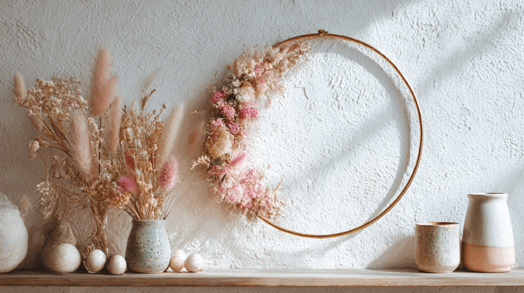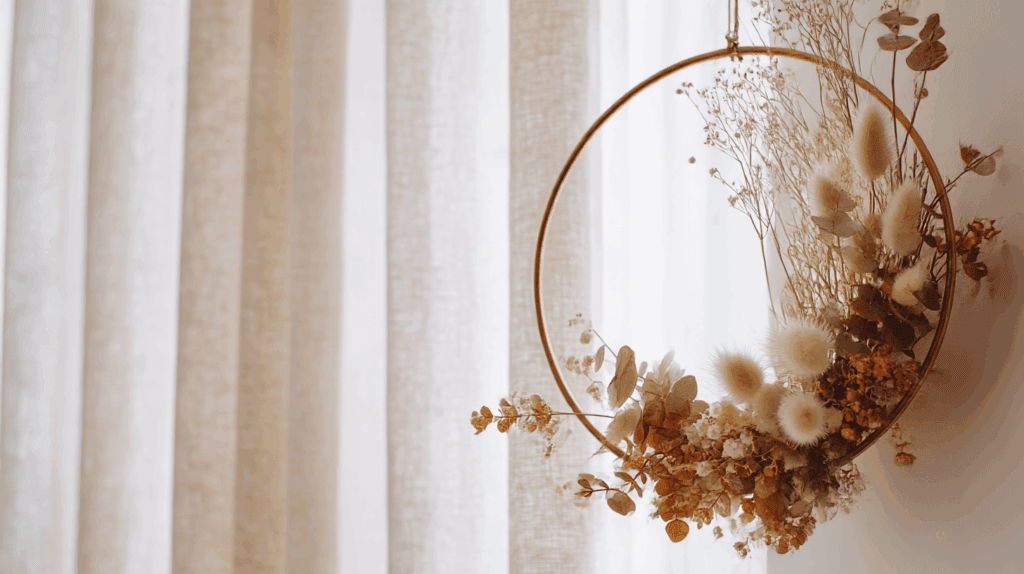 Wenn du Boho-Akzente mit warmem, rustikalem Flair liebst, findest du in „Wohnen im Landhausstil: Kränze mit rustikalem Charme“ Inspiration für natürliche Farbpaletten und Materialkombinationen – ideal für freistehende Ringe oder herbstliche Deko.
