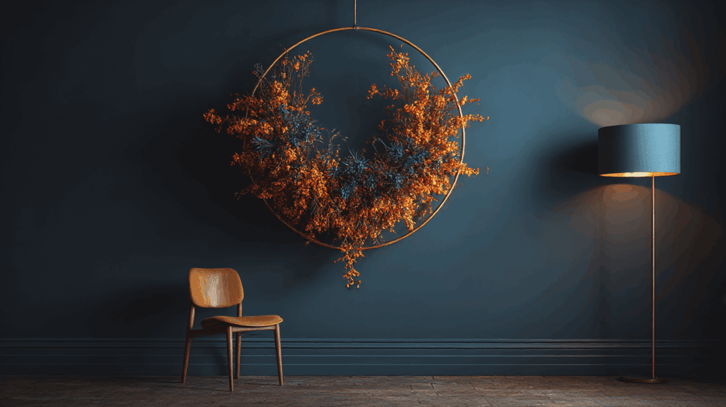 Modern Bold: Wenn du Kontraste liebst, spiele mit kräftigen Farben und klaren Formen. Ein goldener Ring mit pinkem Ruscus oder tiefblauen Disteln wirkt modern, fast architektonisch. Hänge ihn einzeln an eine glatte Wand – weniger Nachbarn, mehr Wirkung.