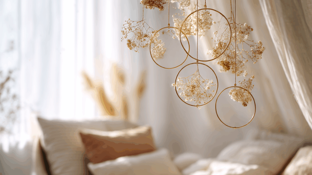 Goldringe und Trockenblumen sind die Abkürzung zu moderner, ruhiger Wohnlichkeit. Der Ring steht für Klarheit und Beständigkeit, die getrockneten Botanicals für Textur und Natürlichkeit. Zusammen entsteht dieser Scandi-Boho-Vibe, der 2025 Wohntrends wie Minimalismus, Naturverbundenheit und Langlebigkeit auf den Punkt bringt.