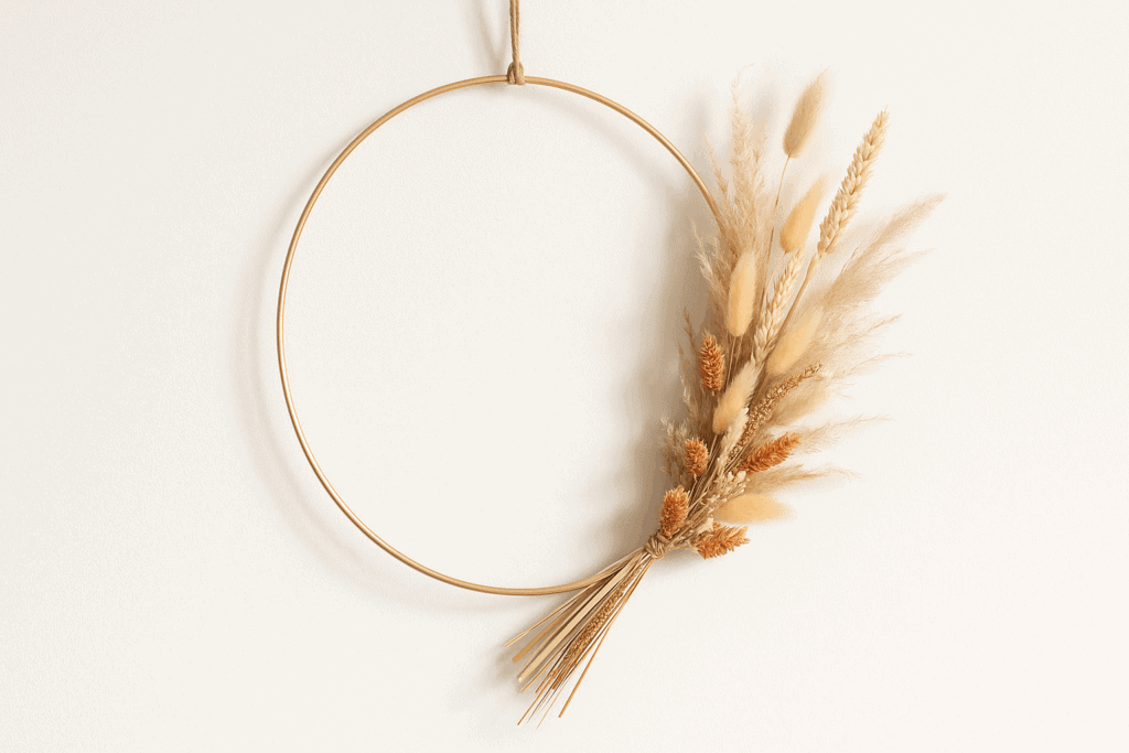 Goldringe und Trockenblumen sind die Abkürzung zu moderner, ruhiger Wohnlichkeit. Der Ring steht für Klarheit und Beständigkeit, die getrockneten Botanicals für Textur und Natürlichkeit. Zusammen entsteht dieser Scandi-Boho-Vibe, der 2025 Wohntrends wie Minimalismus, Naturverbundenheit und Langlebigkeit auf den Punkt bringt.
