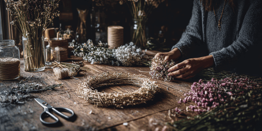 - Brüchigkeit vermeiden: Nutze robust getrocknete Sorten wie Hortensien, Eukalyptus oder Strandflieder – oder verwende halbtrockene Blumen, die direkt am Kranz fertig trocknen.