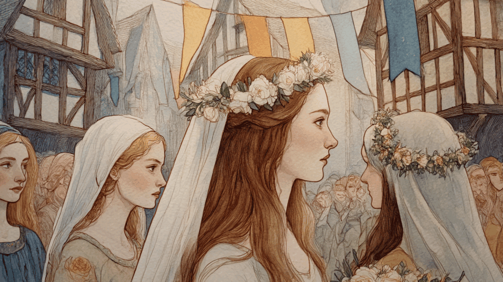 Für Frauen trug der Kranz noch mehr Gewicht – er war ein moralisches Etikett. Der Jungfernkranz, meist aus Myrten oder weißen Blumen, signalisierte Reinheit und Heiratsfähigkeit. Eine junge Frau trug ihn mit offenem Haar, als Zeichen von Unschuld und Würde.