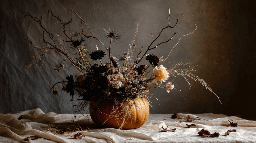 Ein ausgehöhlter Kürbis wird zum Gefäß für dein Arrangement. Mit Trockenblumen wirkt er nicht nur stimmungsvoll, sondern bleibt auch wochenlang schön.