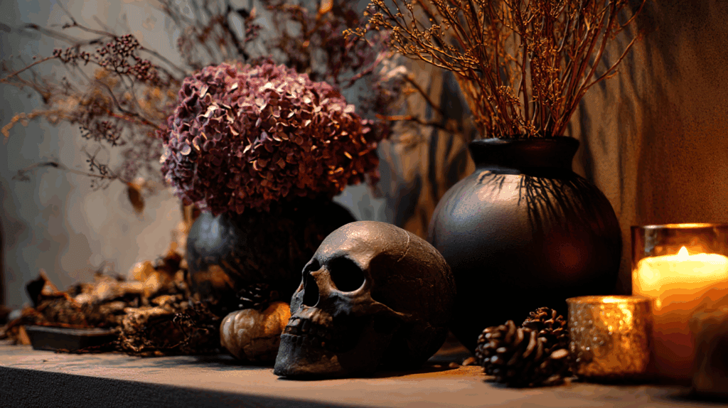 • Gefäße: Statt schlichter Vasen nutzt du opulente Gefäße – etwa Keramikschädel oder barock verzierte Vasen.