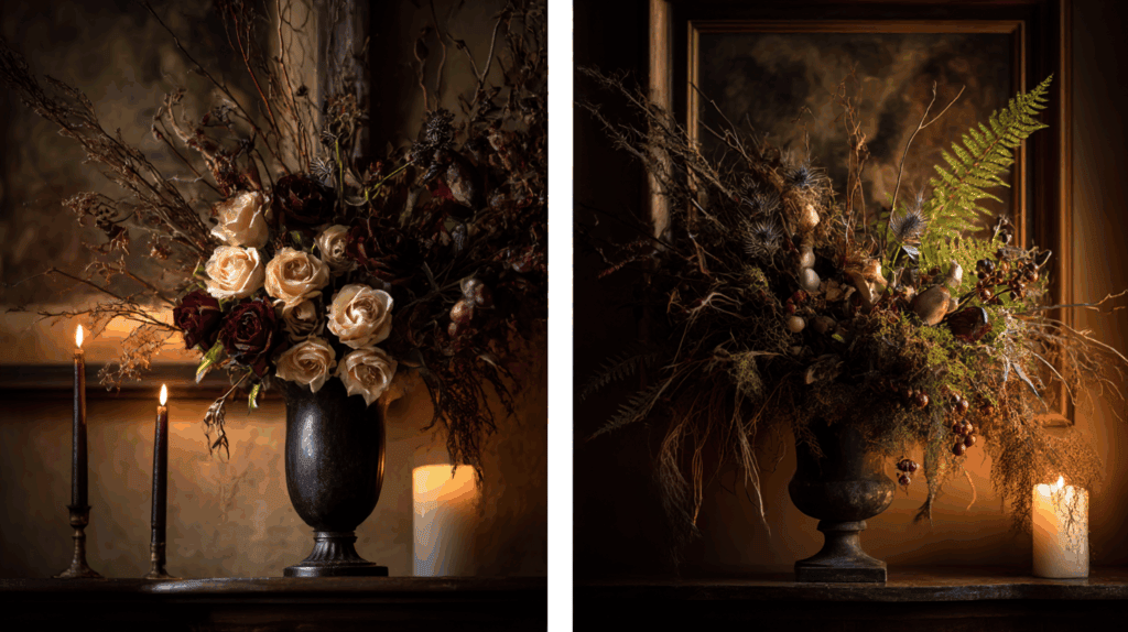 • Blumenwahl: Schwarze Calla-Lilien, tiefrote Rosen und dunkler Eukalyptus verleihen deinen Arrangements eine dramatische Aura.