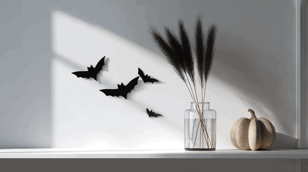 • Akzente: Schwarze Papierfledermäuse an der Wand oder ein schlichter Kranz aus dunklen Zweigen ergänzen das Bild.