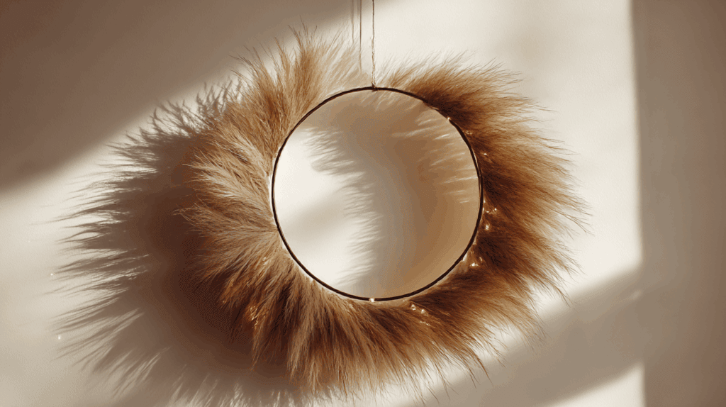 Neben hängenden Mobiles haben auch minimalistische Designs ihren Reiz. Ein moderner Kranz auf Metallring passt perfekt zum Skandi- oder Boho-Stil und wirkt mit einer feinen Lichterkette besonders elegant.