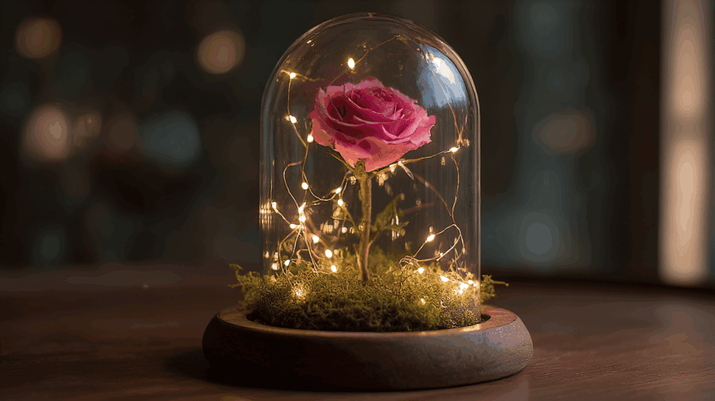 Erinnerst du dich an die Rose in „Die Schöne und das Biest“? Genau diese märchenhafte Stimmung kannst du mit einer Glasglocke (Cloche) erschaffen. Sie schützt die Blüten vor Staub und lässt das Licht sanft im Inneren tanzen.