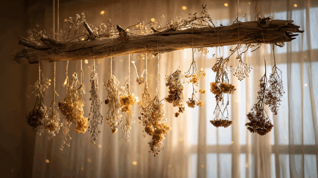 - Hänge kleine Sträußchen aus leichten Trockenblumen wie Schleierkraut oder Glixia an unterschiedlich langen Fäden herab.