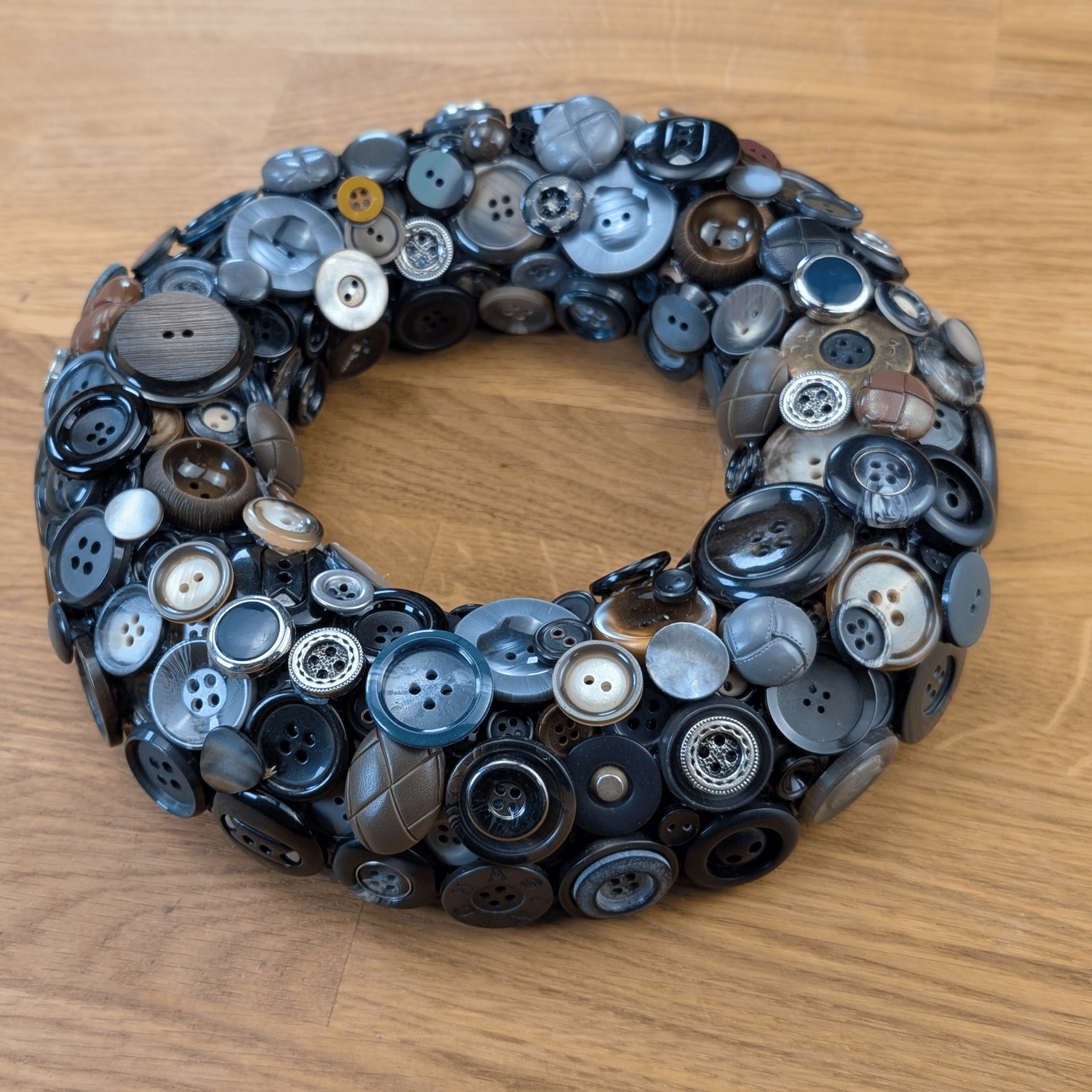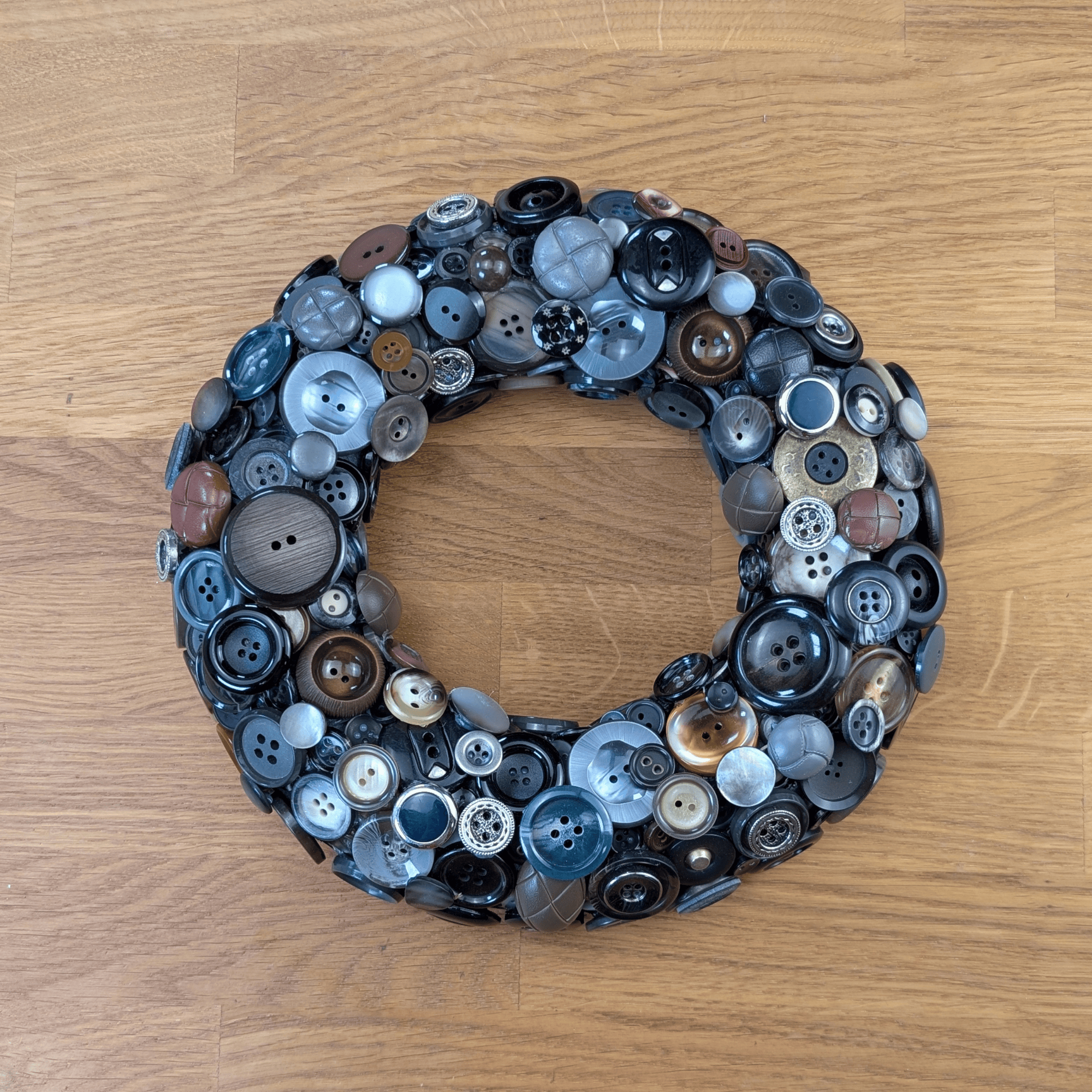 Dieser liebevoll gestaltete Kranz ist alles, nur nicht gewöhnlich. Mit rund 250 Knöpfen aus Holz, Metall und Kunststoff wird jeder Blick zum Entdecken. Ob als origineller Türkranz, bunte Wanddeko oder charmantes Geschenk – dieser Kranz zieht die Aufmerksamkeit auf sich.
