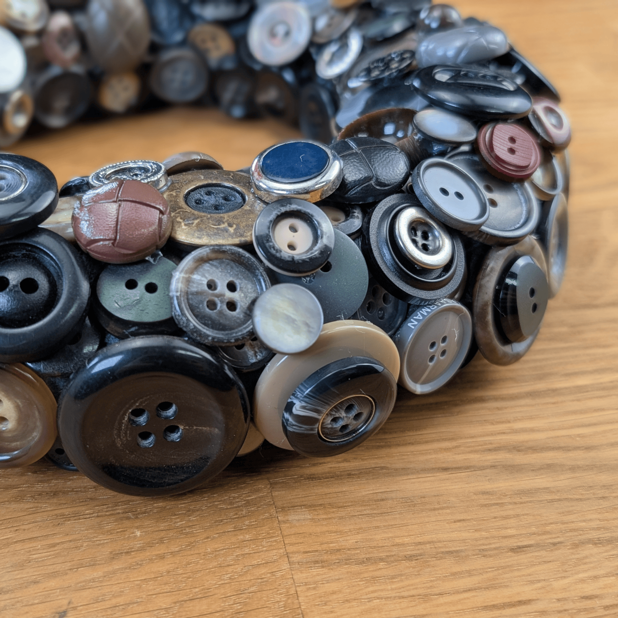 Jeder Knopf wurde einzeln ausgewählt und von Hand auf einem stabilen Strohrömer befestigt. Die unterschiedlichen Formen, Farben und Größen ergeben ein lebendiges, verspieltes Gesamtbild – fröhlich, kreativ und garantiert einzigartig.