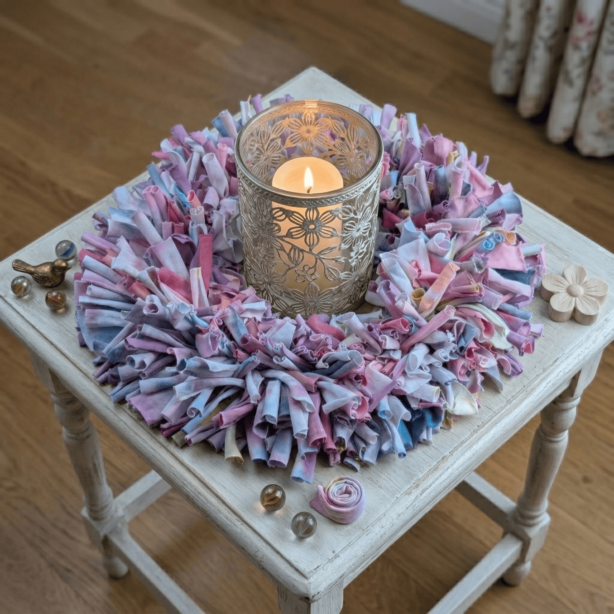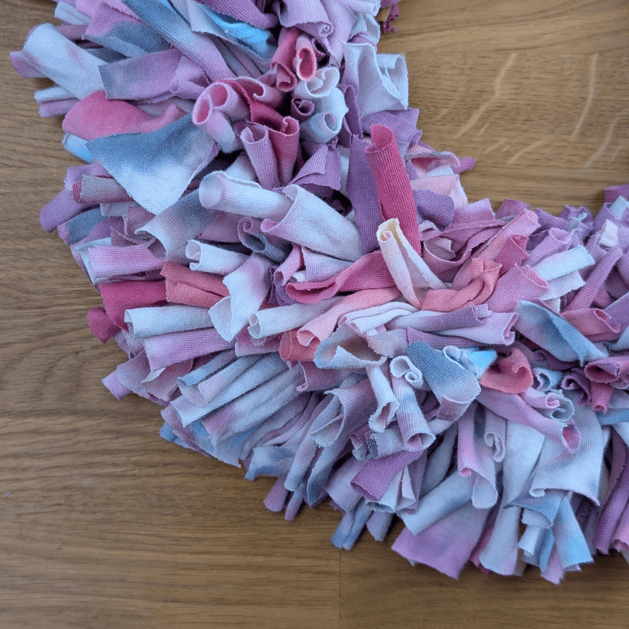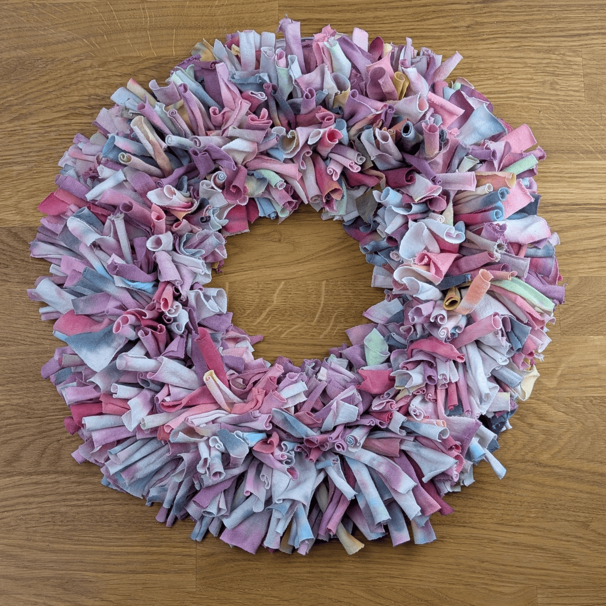 Besonders macht diesen Kranz die Kombination aus Upcycling-Idee, ungewöhnlicher Materialwahl und sanfter Farbwirkung. Der gefärbte T-Shirtstoff verleiht ihm einen modernen, textilen Charakter, der sich deutlich von klassischen Kränzen abhebt. Dadurch entsteht ein dekoratives Objekt mit Persönlichkeit, Leichtigkeit und kreativem Ausdruck.