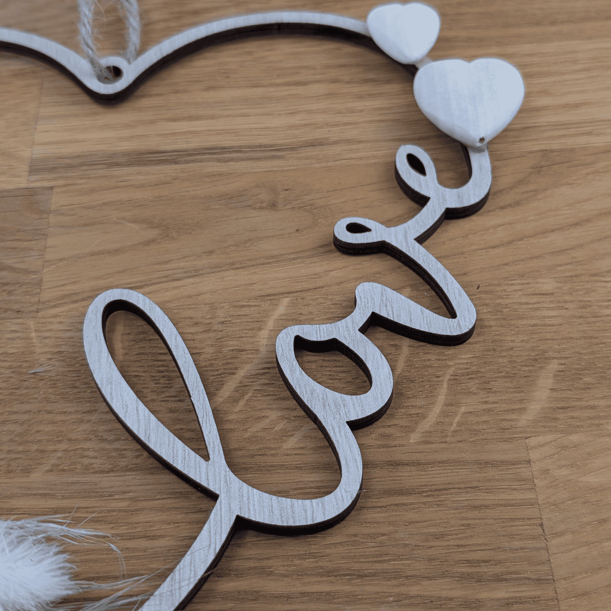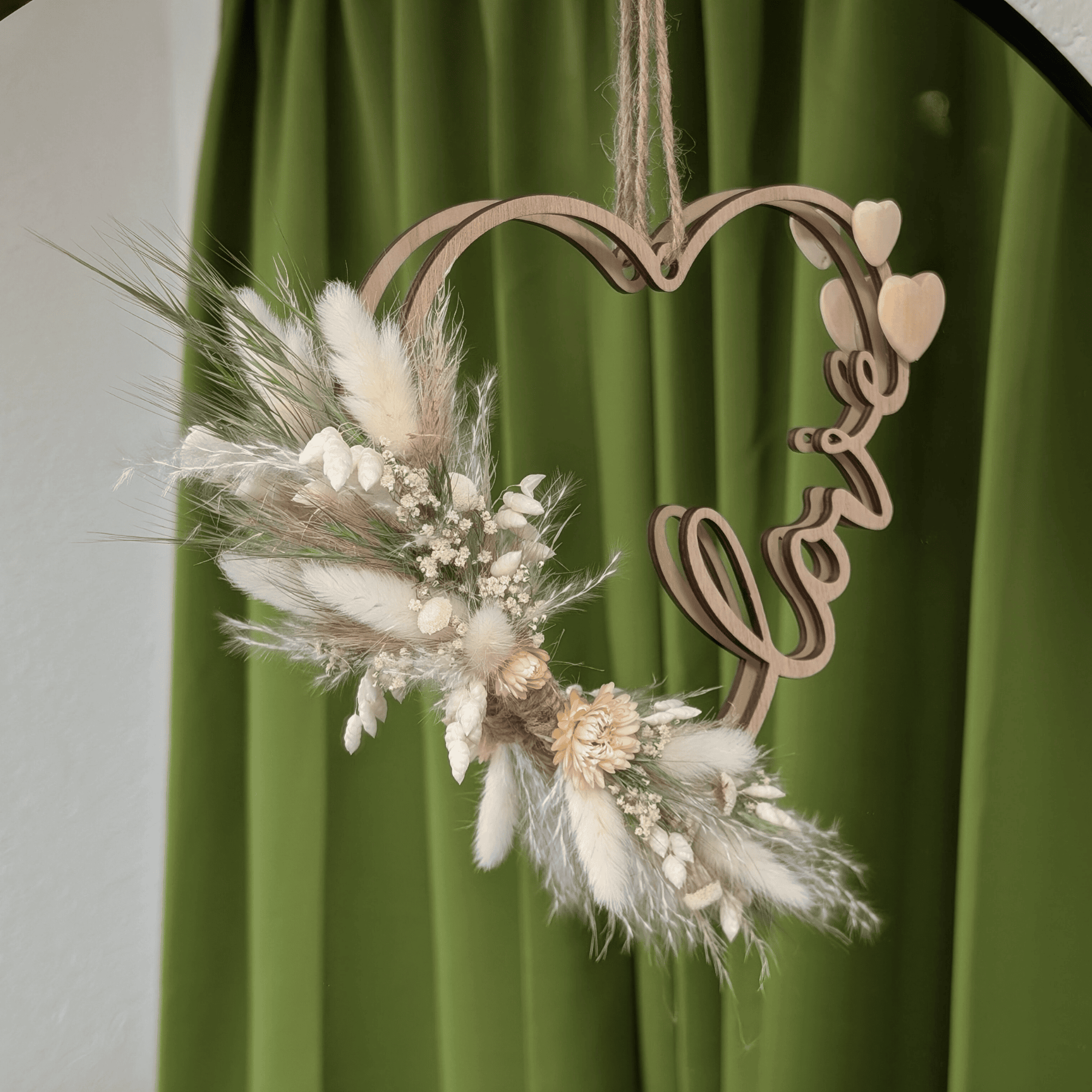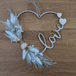 Dieses dekorative Holzherz vereint romantische Botschaft mit natürlicher Gestaltung. Auf einem stabilen Holzgestell mit dem Schriftzug LOVE wurden liebevoll Trockenblumen arrangiert – in zarten Weiß- und Cremetönen, kombiniert mit Naturmaterialien wie Juteschnur und Draht. Perfekt als Geschenk, Tischdeko oder besonderer Blickfang an der Wand.