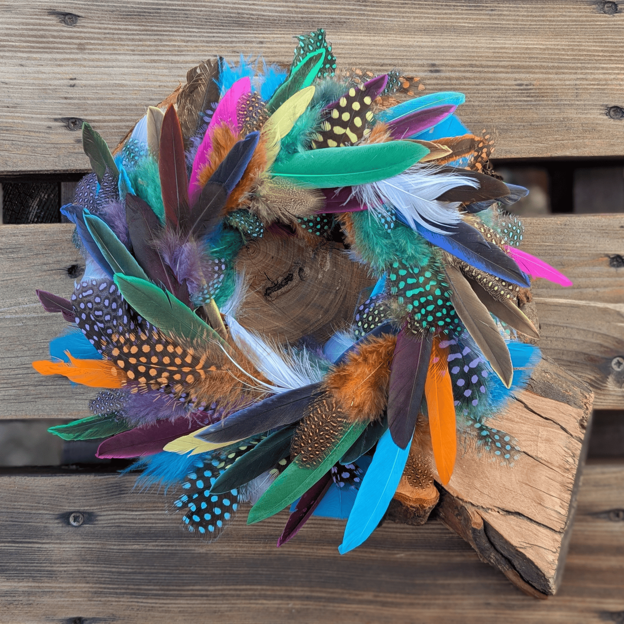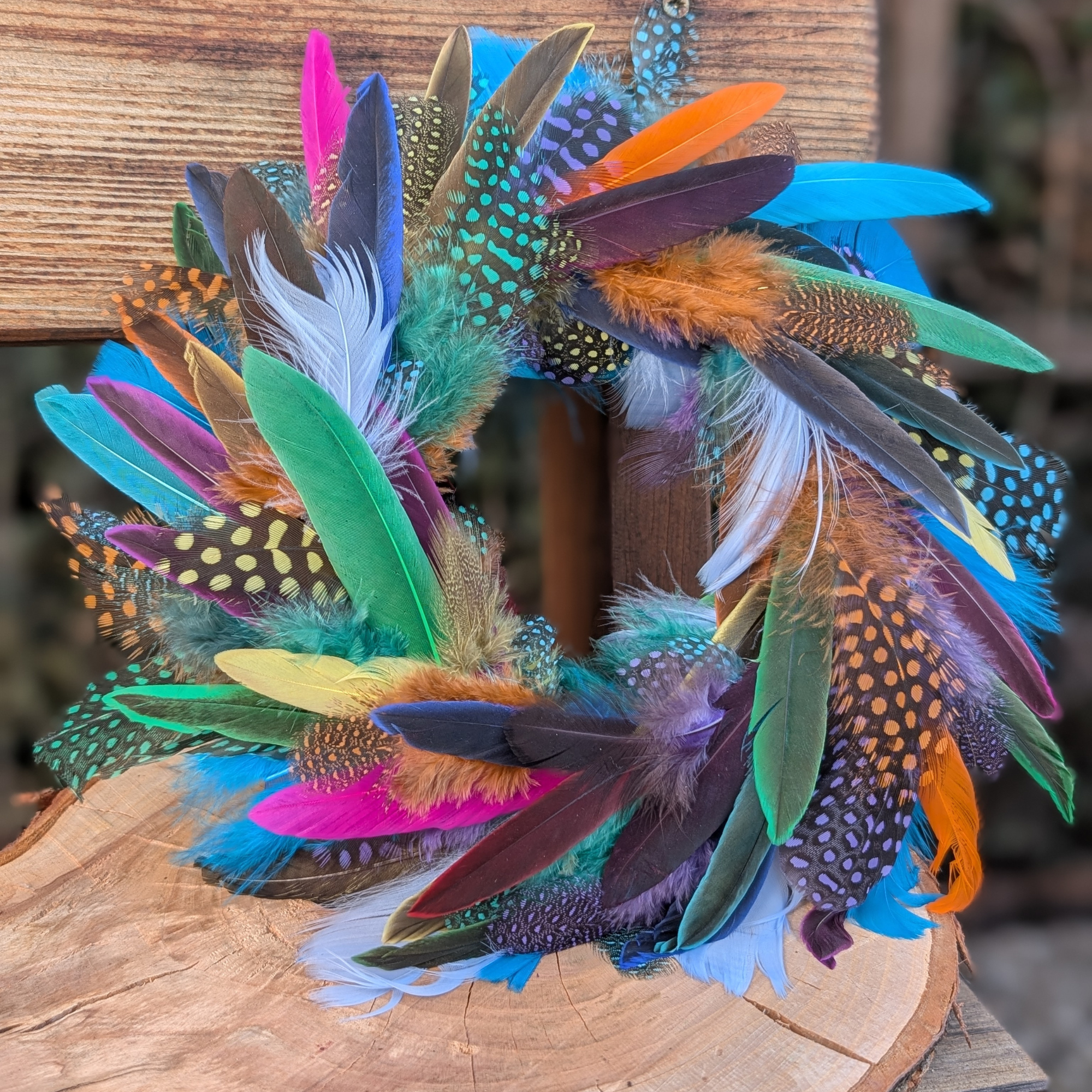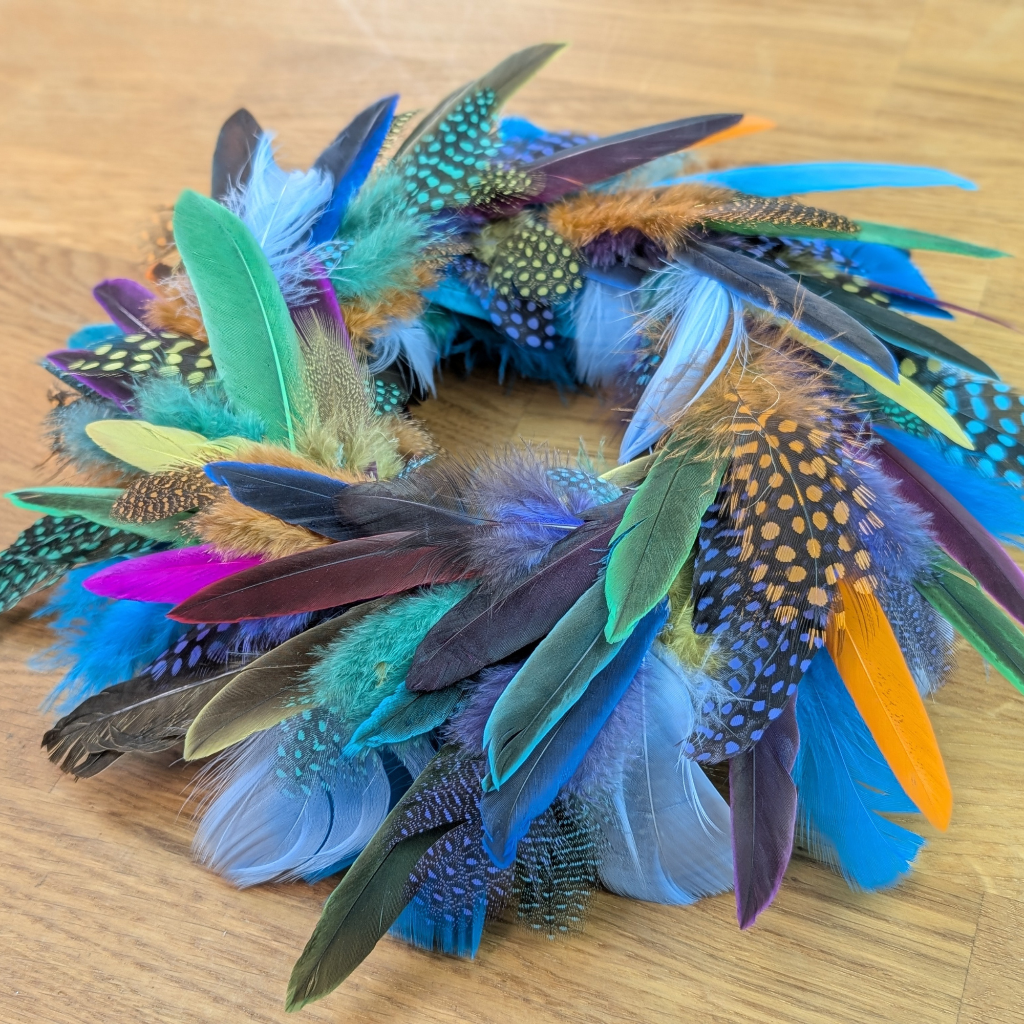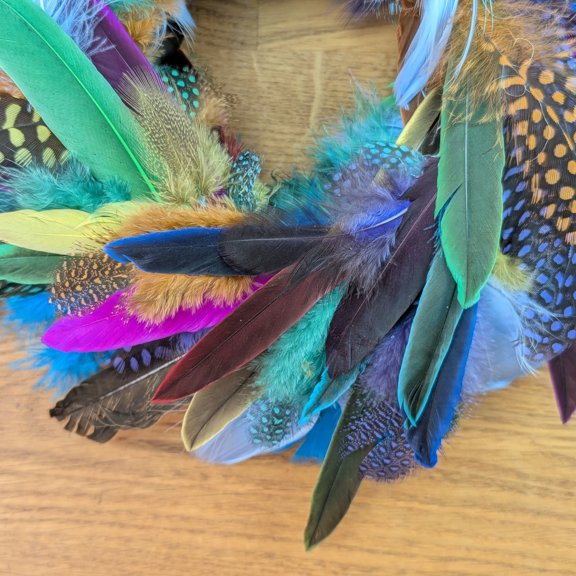 Dieser Kranz lebt von seiner natürlichen Vielfalt. Jede Feder besitzt ihre eigene Struktur und Farbintensität, wodurch ein lebendiges und einzigartiges Gesamtbild entsteht. Die Kombination verschiedener Federarten sorgt für Bewegung und Tiefe, sodass der Kranz aus jedem Blickwinkel interessant wirkt.