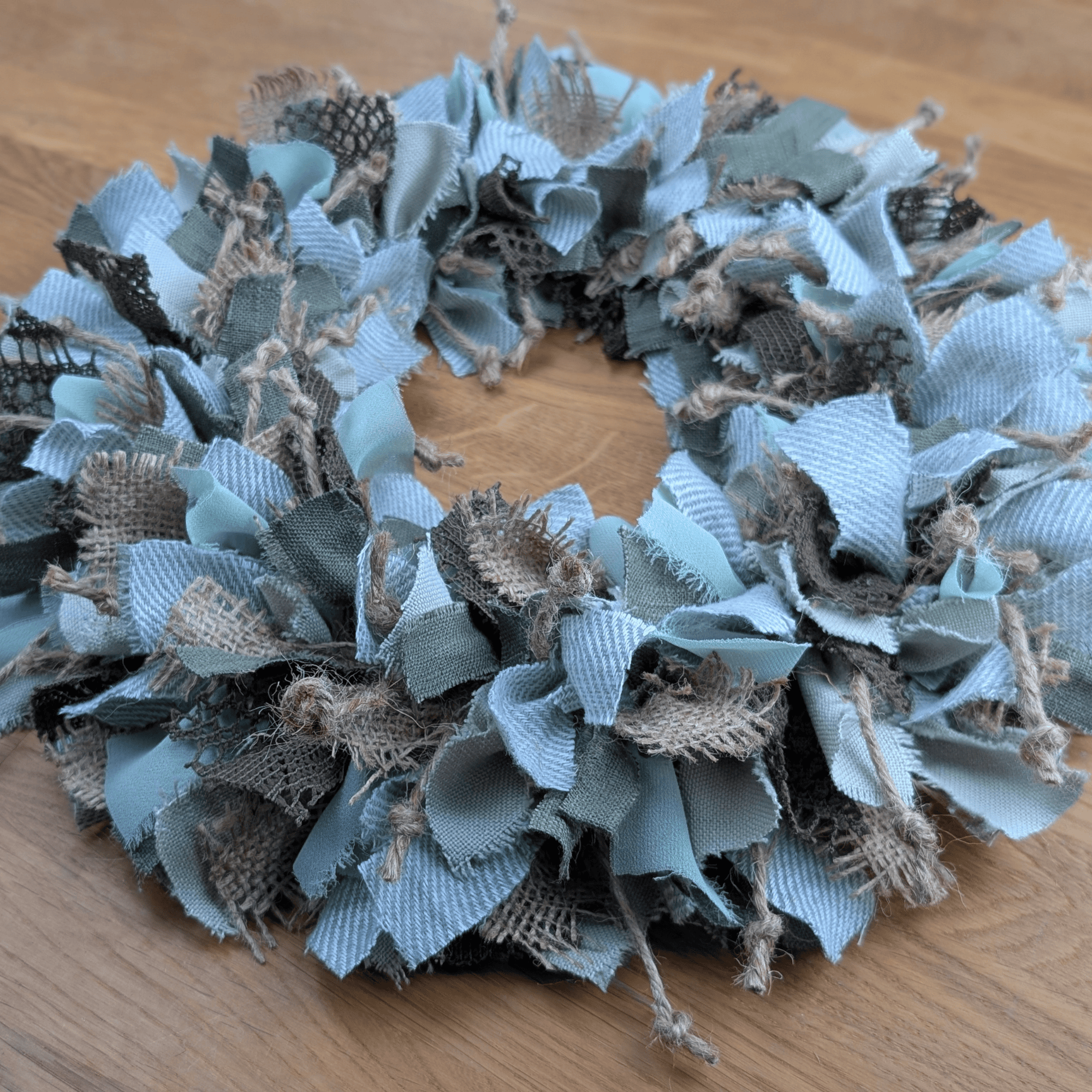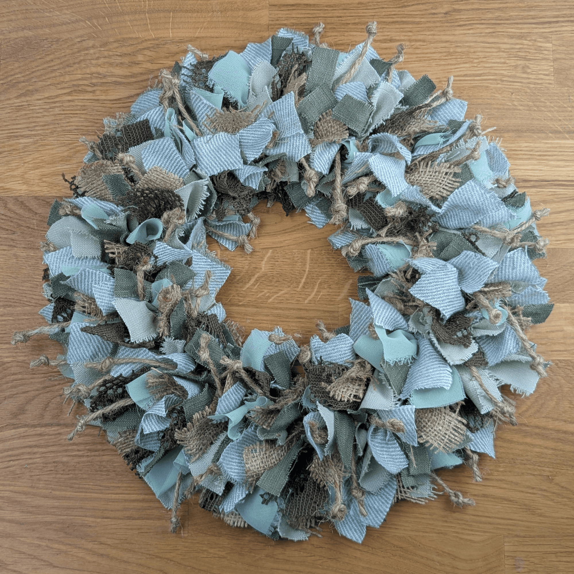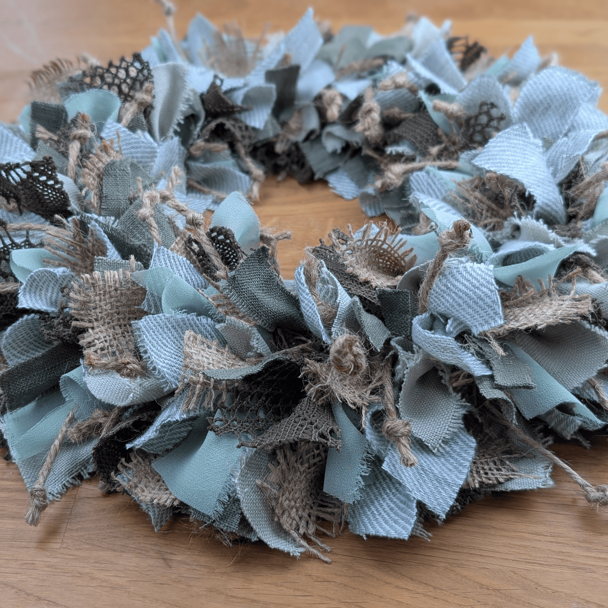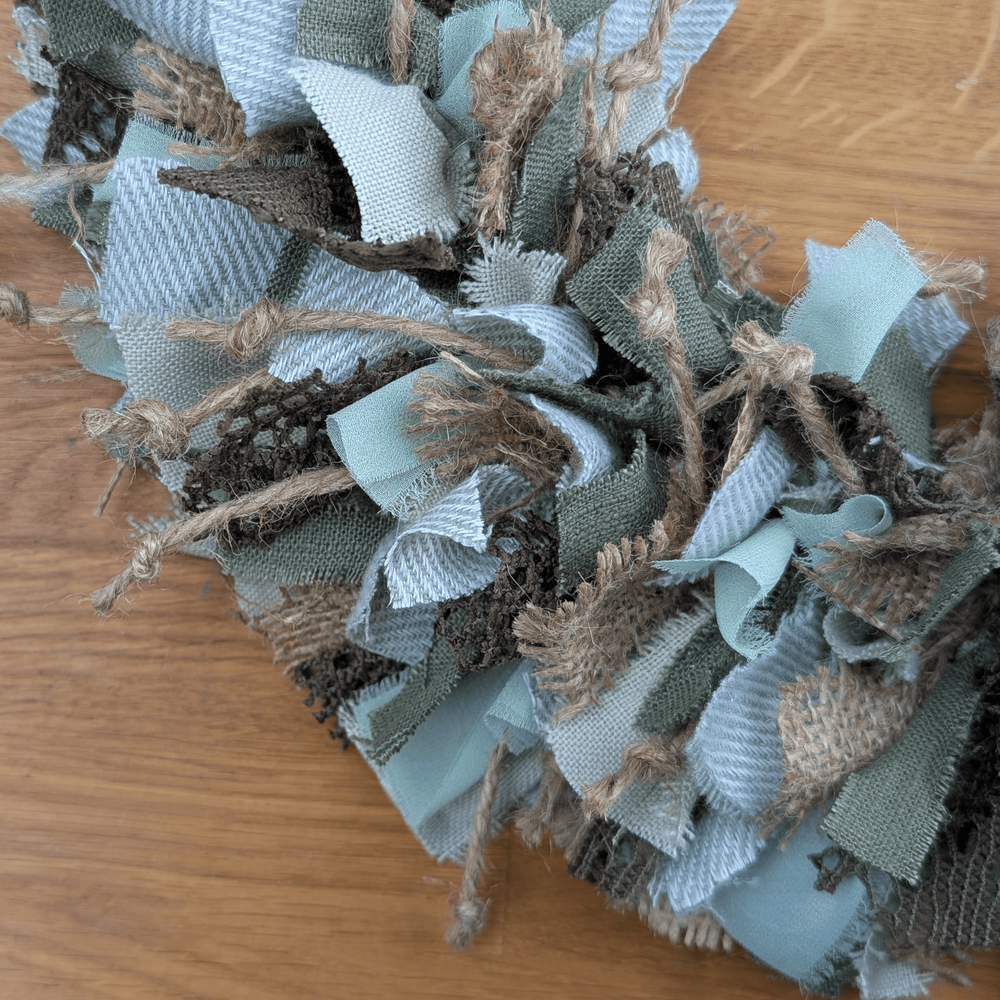 Dieser Textilkranz vereint natürliche Wärme mit frischen Grüntönen und einer charmanten Upcycling-Optik. Die Kombination aus braunen Nuancen und verschiedenen Grünabstufungen wirkt lebendig, harmonisch und angenehm ruhig. Unterschiedliche Stoffarten sorgen für Struktur und Bewegung, während Jute dem Kranz eine rustikale, naturverbundene Ausstrahlung verleiht. So entsteht ein dekorativer Blickfang, der Gemütlichkeit und Individualität stilvoll miteinander verbindet.