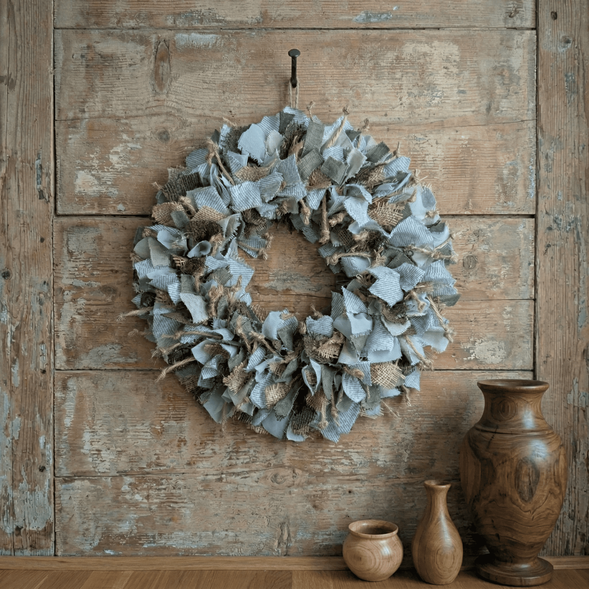 Der Metallkranz bildet die stabile Grundlage und sorgt für eine klare, gleichmäßige Form. Durch den Materialmix entsteht ein dekoratives Objekt, das leicht wirkt und zugleich Präsenz zeigt. Gerade die Verbindung aus wiederverwendeten Stoffen und natürlicher Jute macht diesen Kranz zu einer stilvollen Wahl für alle, die individuelle Wohnakzente lieben.