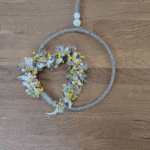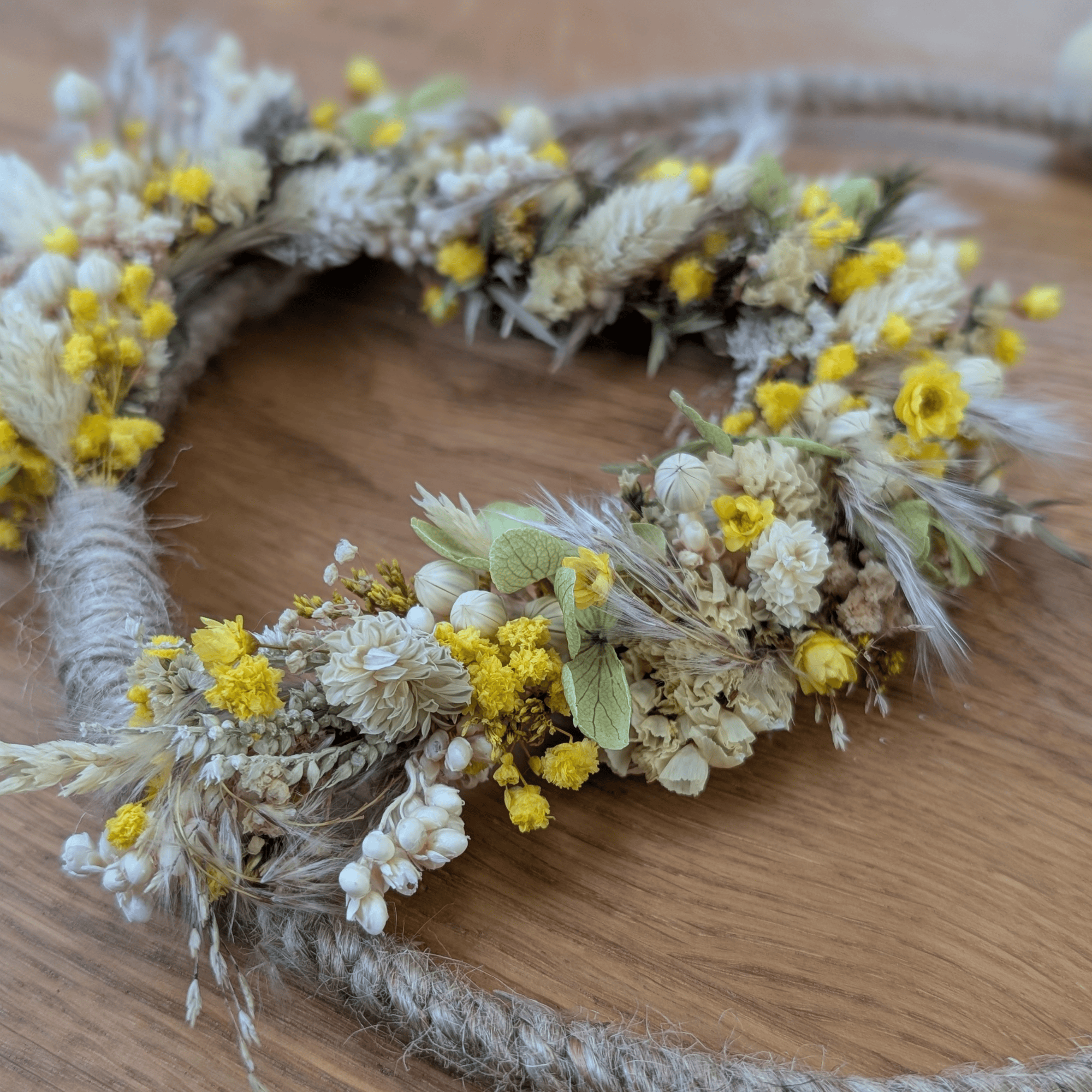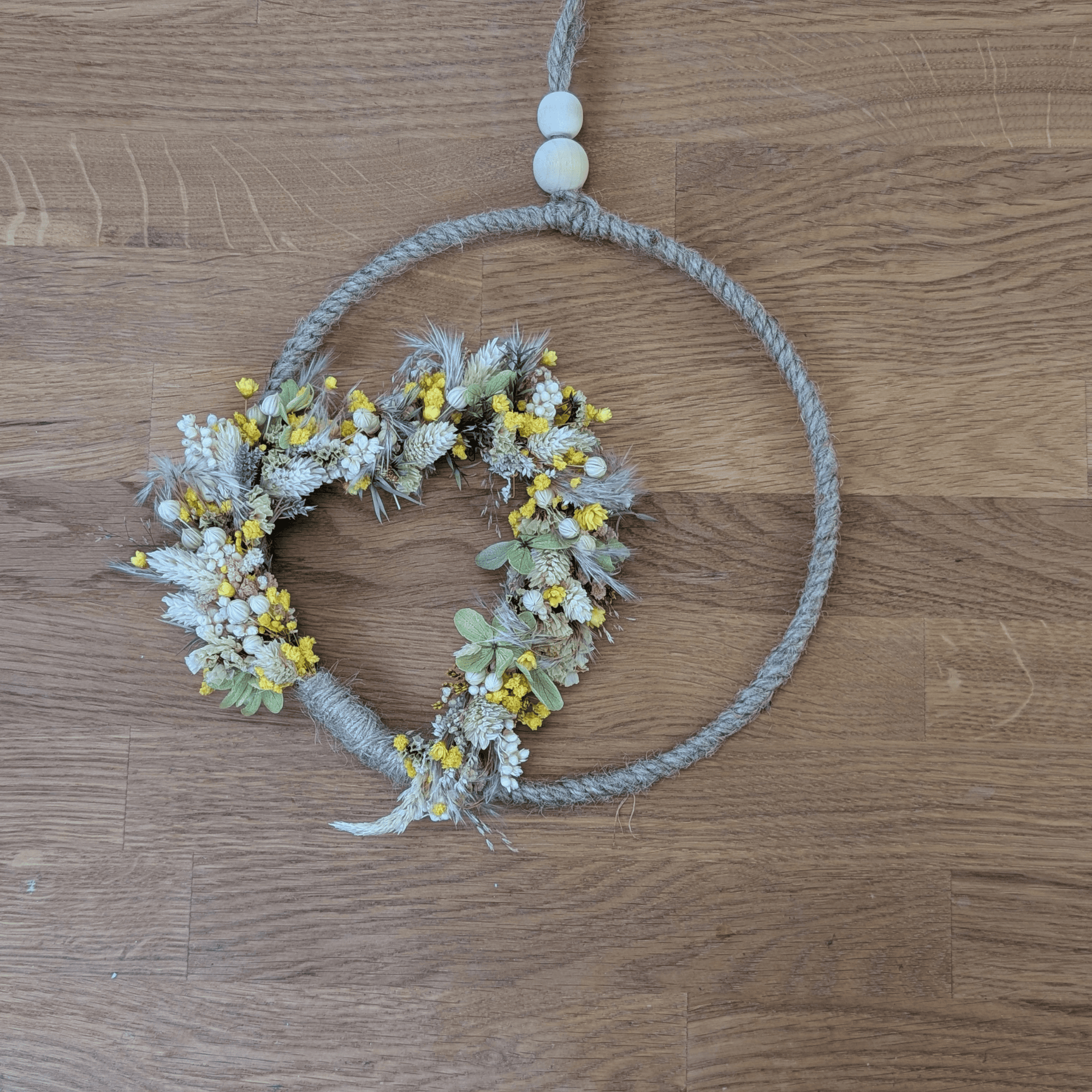 Dieser liebevoll gebundene Trockenblumenkranz überzeugt durch seine harmonische Farbwelt in Beige, Gelb und Grün – ruhig, freundlich und voller Struktur. Die Kombination aus einem schlichten Drahtring mit Drahtherz, Juteschnur und kleinen Holzperlen verleiht dem Kranz eine charmante, leicht verspielte Optik – ideal für moderne Naturdeko mit einem Hauch Boho.