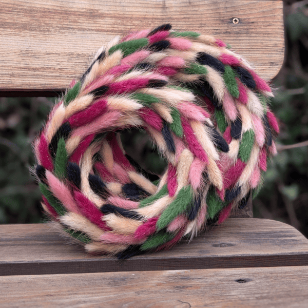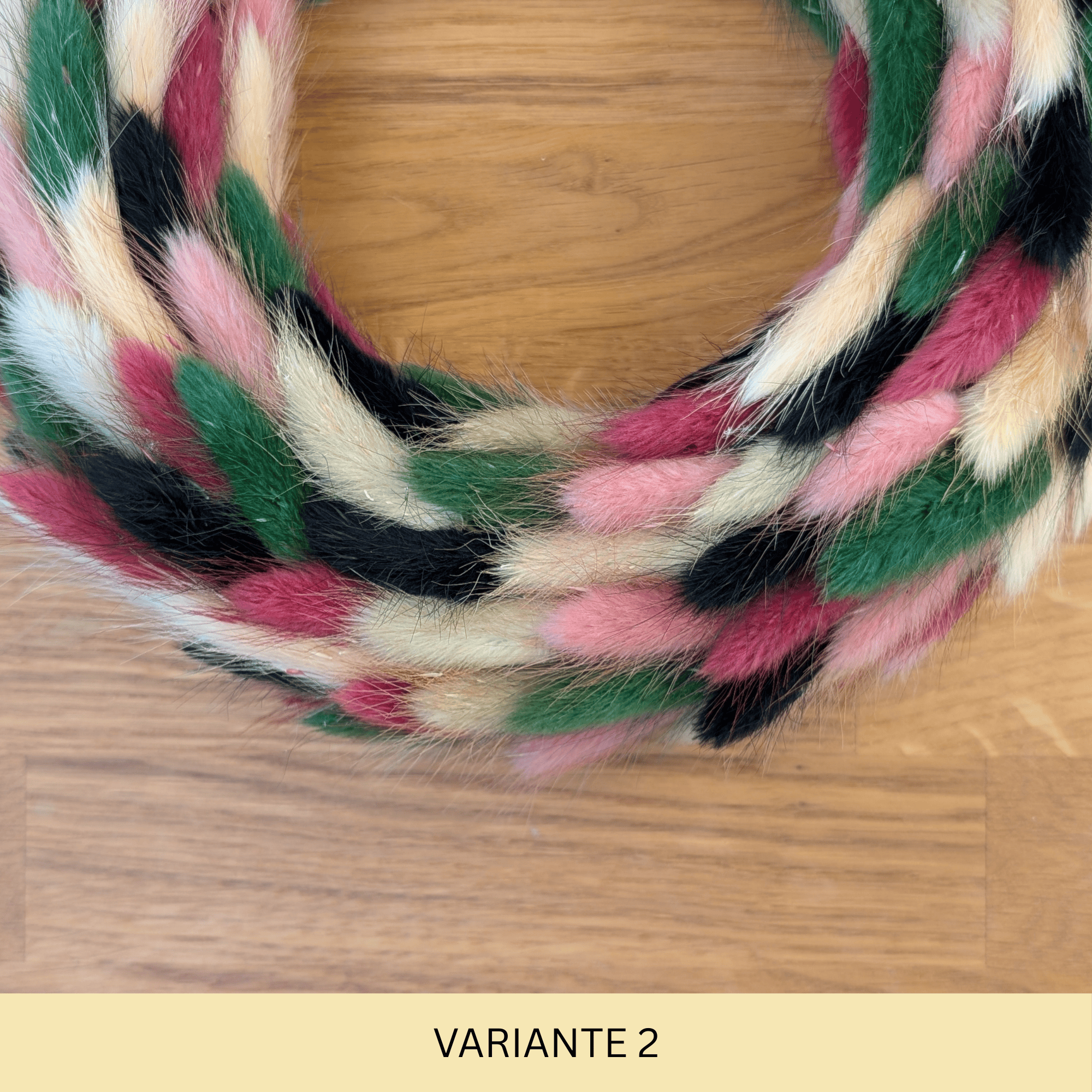 Die verschiedenen Farbtöne bringen Bewegung in das Design und lassen den Kranz lebendig wirken, ohne seine natürliche Leichtigkeit zu verlieren. Gerade das Zusammenspiel aus soften Nuancen und dunkleren Akzenten macht ihn zu einem stilvollen Blickfang mit besonderer Ausstrahlung.