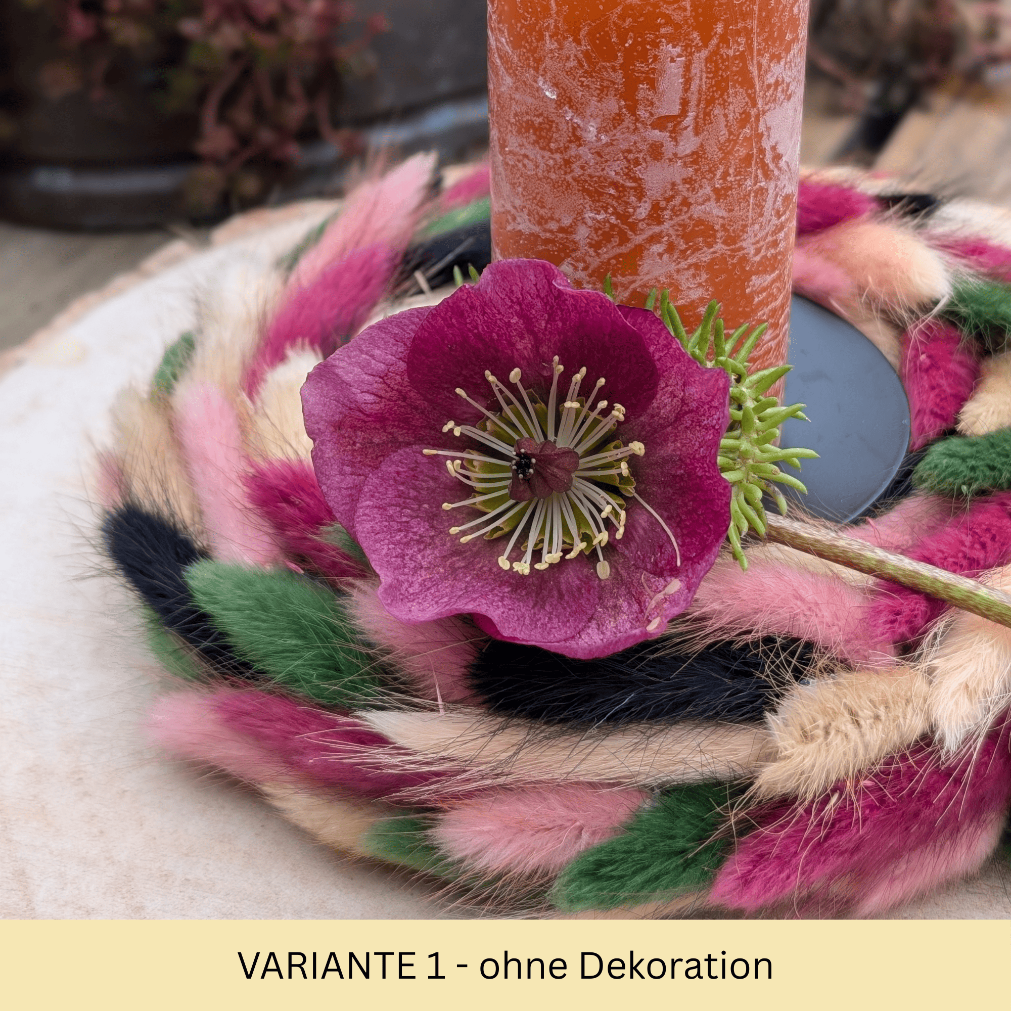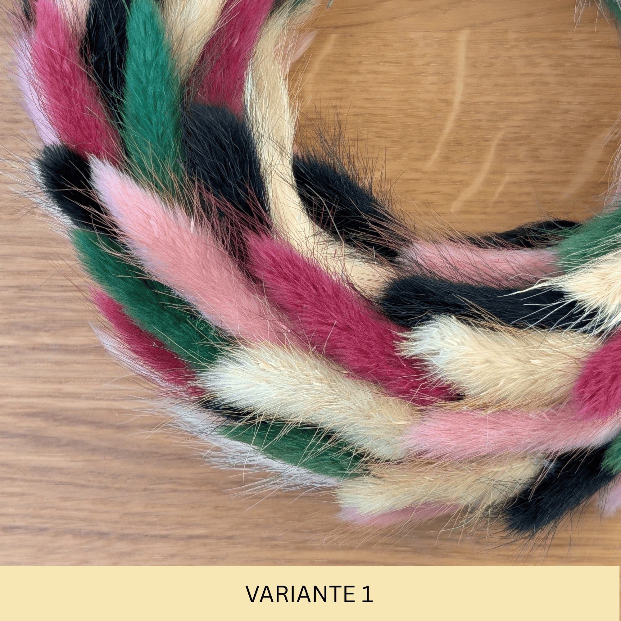 Dieser einseitig handgeklebte Trockenblumenkranz lebt von der besonderen Wirkung verschiedener Hasenschwanzgräser und einer ausdrucksstarken Farbwelt in Beige, Apricot, Pink, Rosa, Schwarz und Grün. Die weichen Formen der Gräser verleihen ihm eine leichte, fast schwebende Ausstrahlung, während die kontrastreichen Nuancen dem Design Tiefe und Charakter geben. So entsteht ein Kranz, der gleichzeitig sanft, modern und dekorativ wirkt.