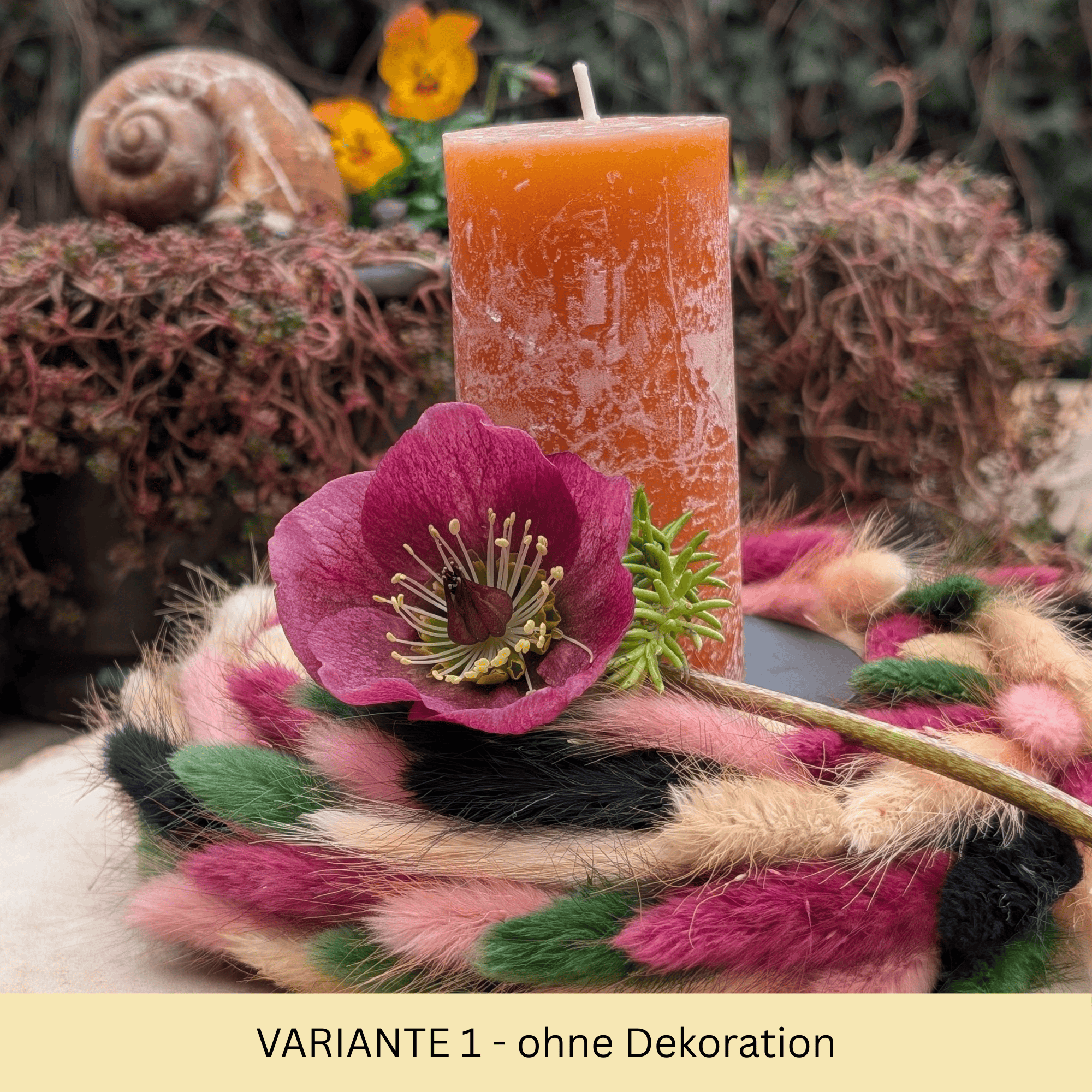 Die Basis bildet ein Strohrömer, der dem Kranz Stabilität und eine schöne Form gibt. Durch das Abwickelband erhält die Grundlage einen sauberen Aufbau, auf dem die einzelnen Elemente sorgfältig arrangiert werden. Das Hasenschwanzgras wird einseitig handgeklebt und gezielt in Szene gesetzt, sodass eine ruhige, ausgewogene Komposition entsteht.