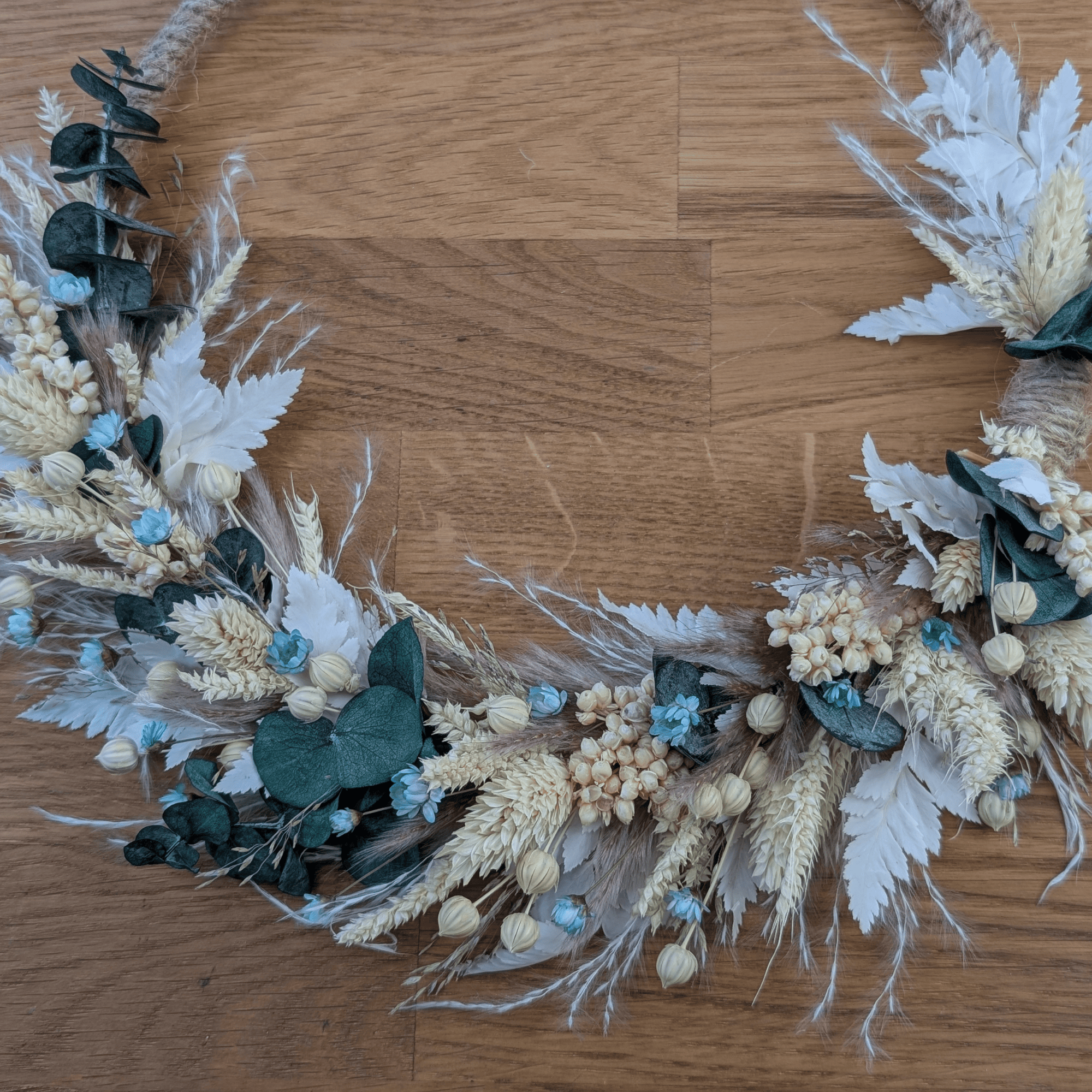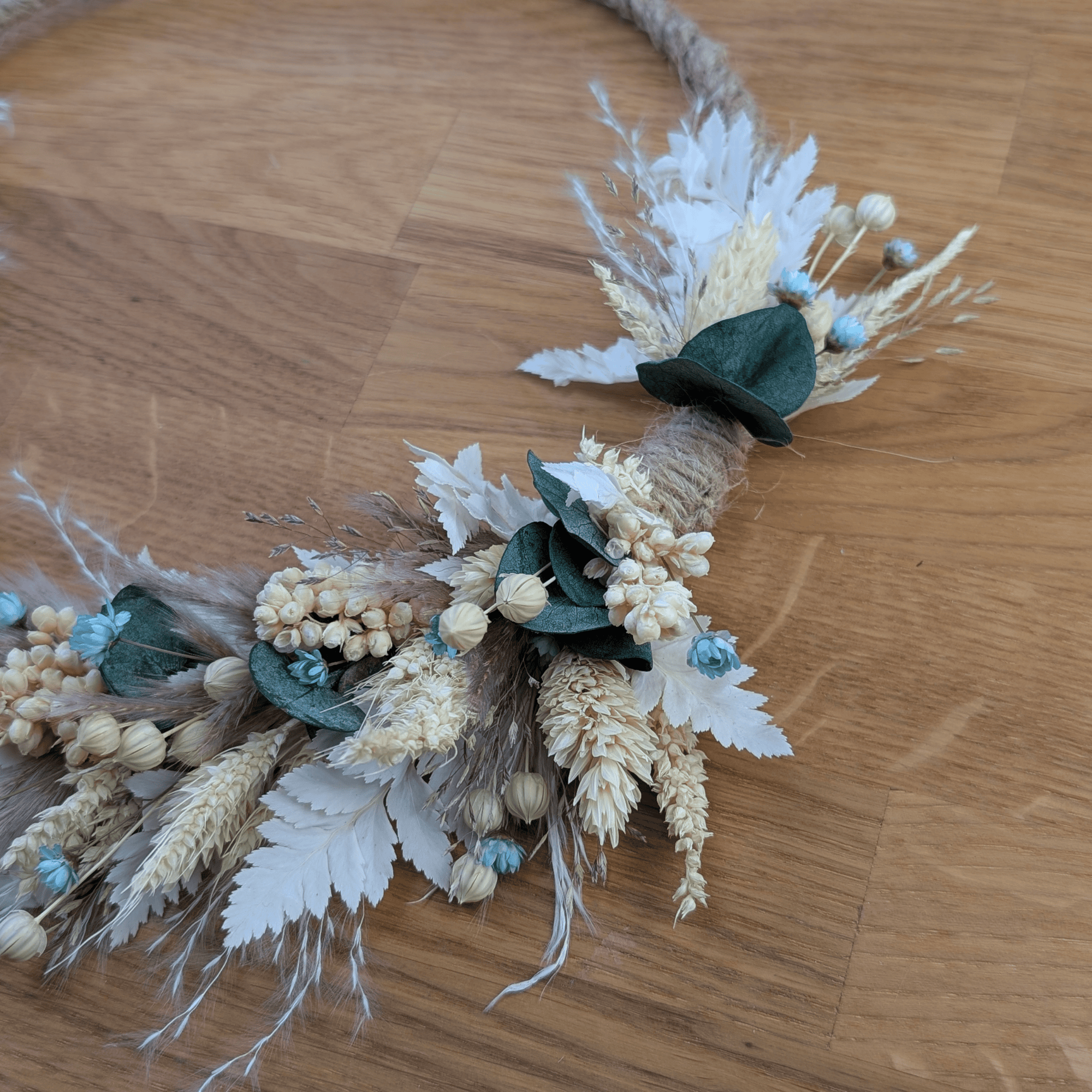 Gebunden auf einem feinen Drahtring, gehalten von Juteschnur und stabilisiert mit Draht, entsteht ein luftiges Design, das gleichzeitig fest im Detail verwurzelt ist. Glixia, Flachs und Phalaris bringen Textur, während die Farbpalette dezent und natürlich bleibt – ideal für moderne Räume mit klarer Formensprache.