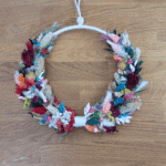 Dieser liebevoll, beidseitig gewickelter Kranz vereint florale Leichtigkeit mit einem modernen, textilen Akzent. Gebunden auf einem filigranen Drahtring, umwickelt mit feiner Makrameekordel, bildet er die perfekte Balance zwischen Natürlichkeit und Gestaltung. Eine einzelne Holzperle am oberen Abschluss verleiht dem Kranz einen sanften Boho-Touch – unaufdringlich, aber wirkungsvoll.