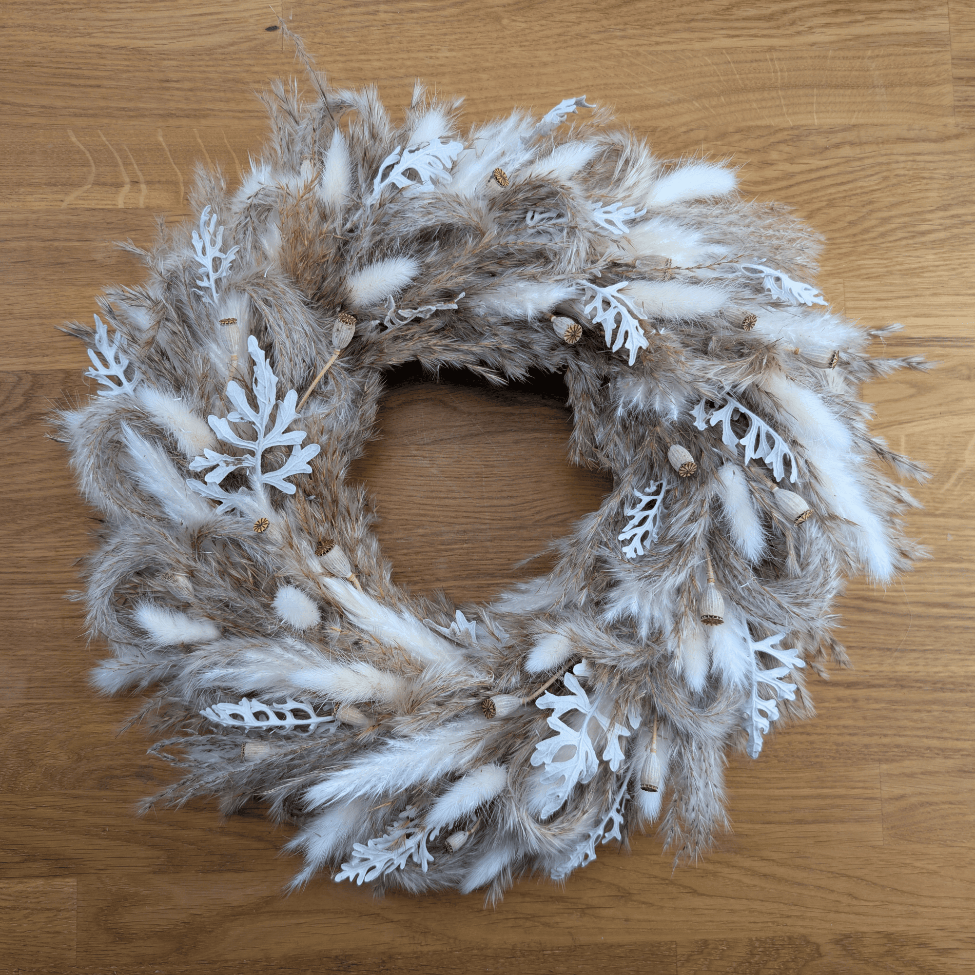 Dieser beeindruckende Trockenblumenkranz bringt mit 37 cm Durchmesser natürliche Größe und feine Detailverliebtheit zusammen. Verschiedene Pampasgräser, zartes Hasenschwanzgras und strukturreiche Mohnkapseln sorgen für Tiefe und Charakter, während Silberblatt edle Akzente setzt.