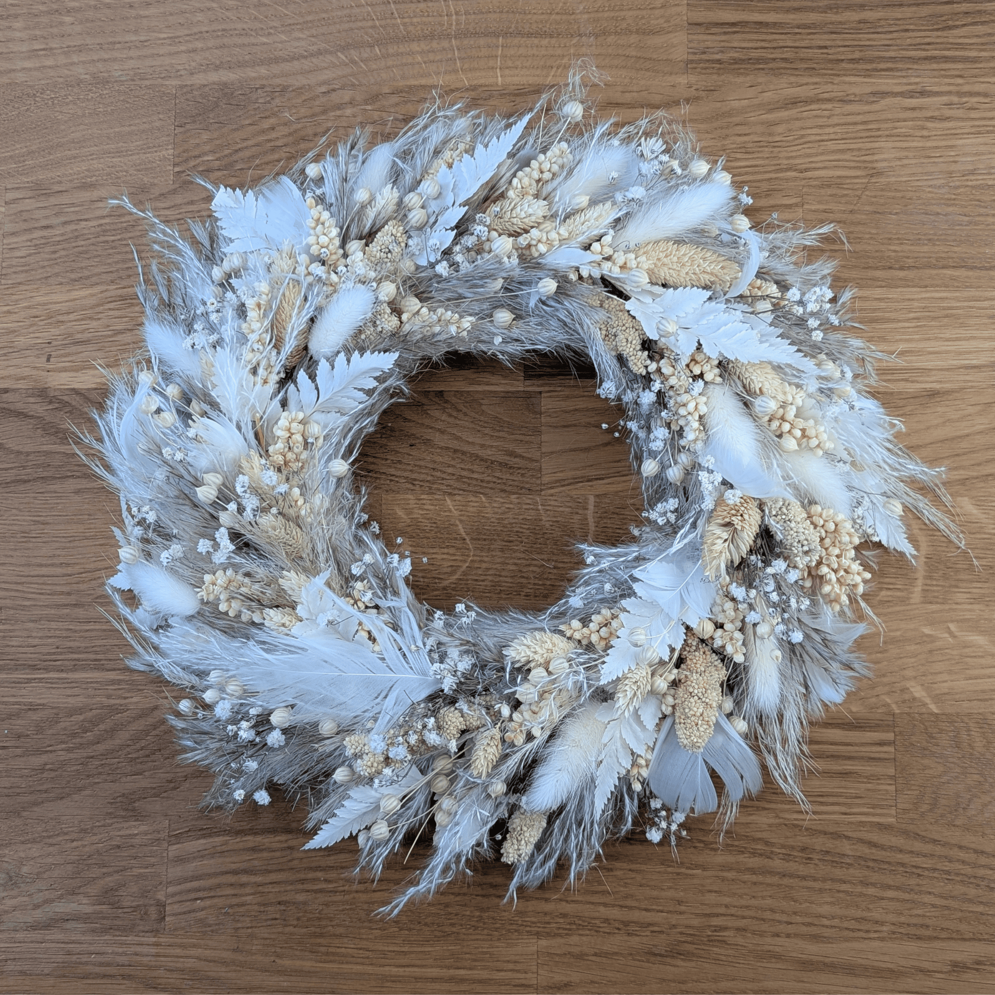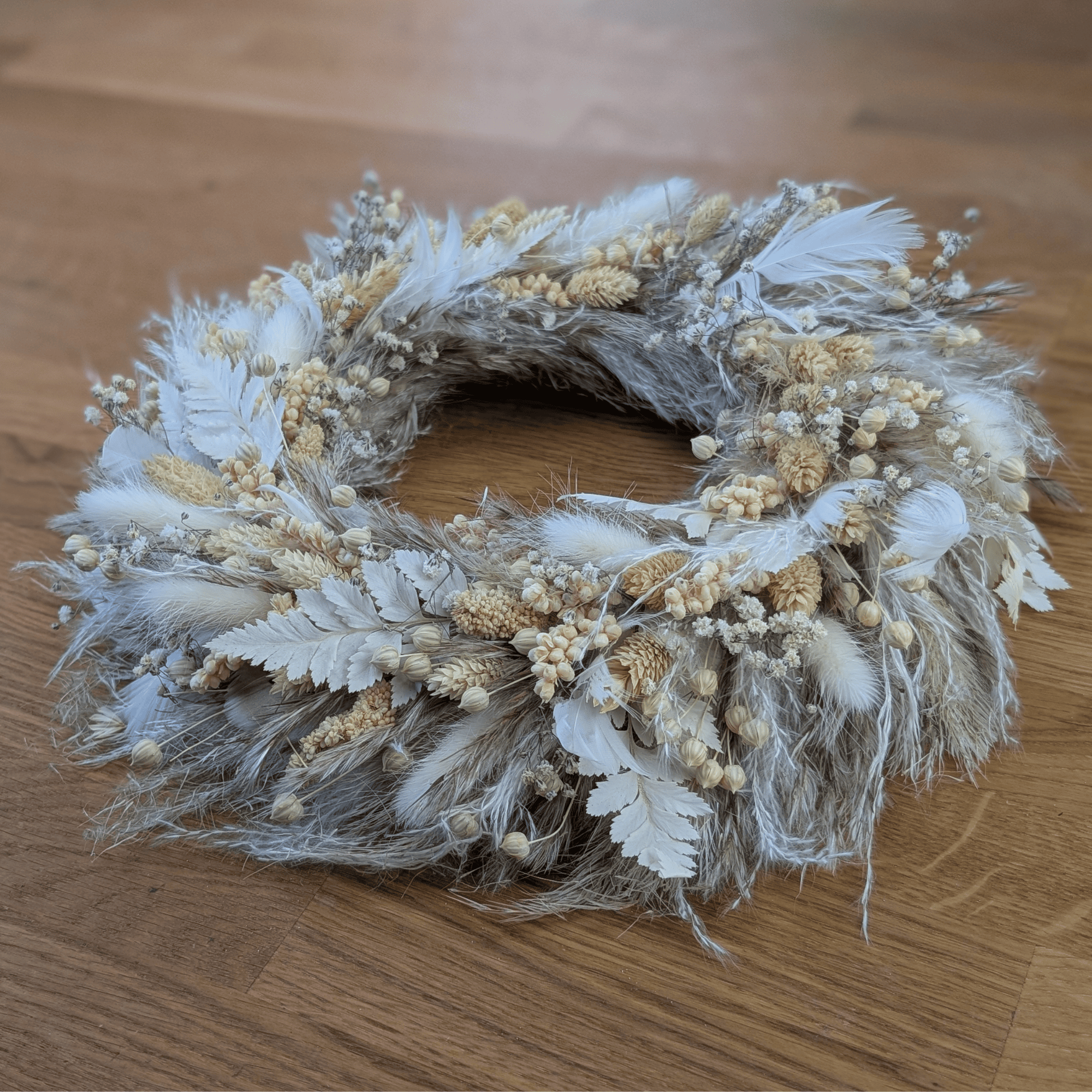 Dieser handgefertigte Trockenblumenkranz vereint sanfte Farben mit abwechslungsreicher Textur. Beige und Weiß sorgen für eine ruhige, elegante Wirkung – ideal für alle, die eine stilvolle, unaufgeregte Dekoration suchen.