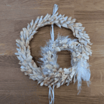 Diese handgefertigten Trockenblumenkränze kommen im Doppelpack – ein großer und ein kleiner Kranz, die gemeinsam oder einzeln dekoriert werden können. Das Design spielt mit Gegensätzen: Zarte Naturmaterialien wie Pampasgras, Flachs und Briza treffen auf ungewöhnliche Akzente wie echte Buchseiten und feine Federn. So entsteht ein Stil, der natürlich, luftig und doch überraschend individuell ist.