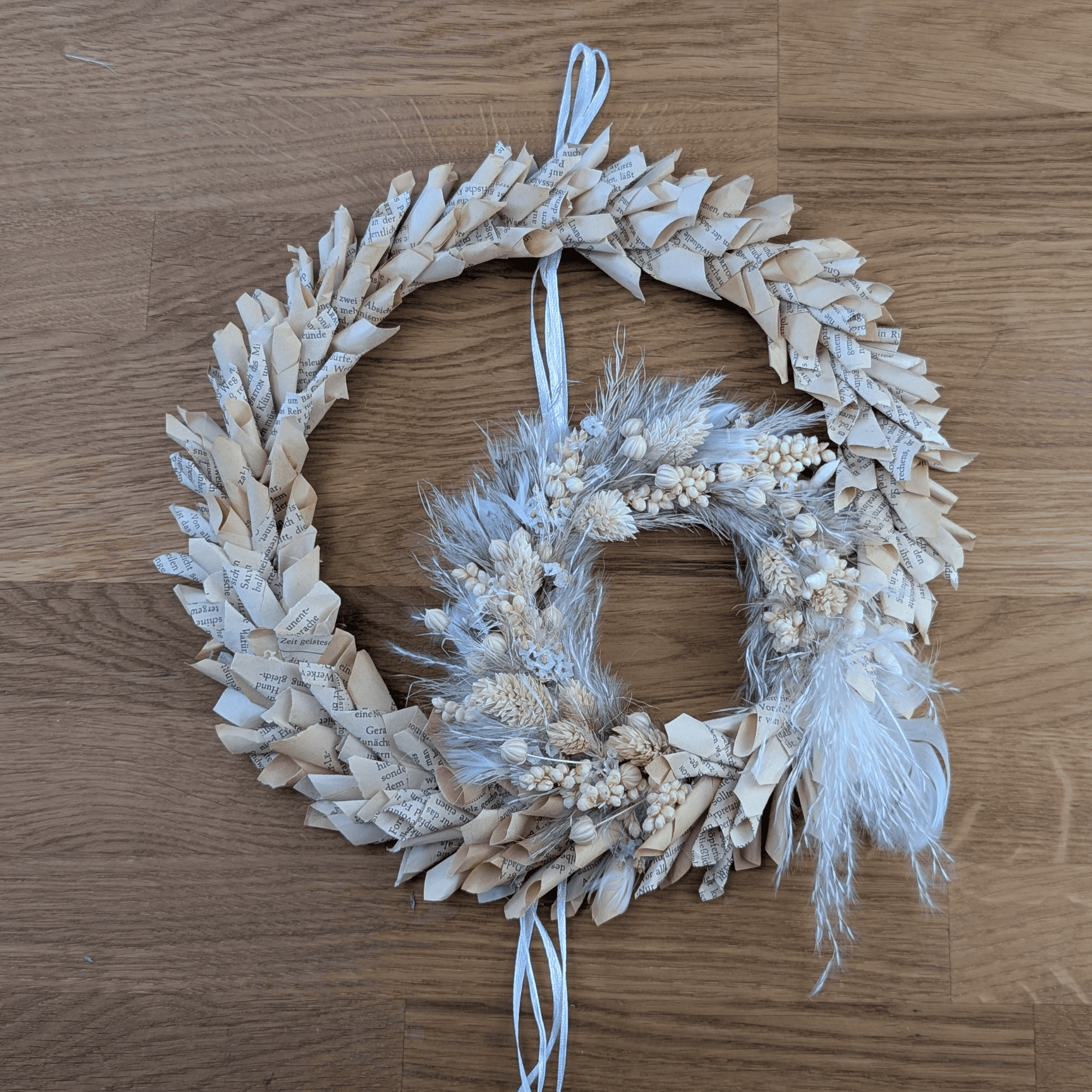 Beide Kränze sind auf zarten Drahtringen gebunden, mit Draht und Abwickelband sorgfältig fixiert und mit einem dekorativen Band veredelt. Die Buchseiten sorgen für einen Hauch Vintage, die Trockenblumen für natürliche Eleganz – ein außergewöhnliches Duo für alle, die es stilvoll, aber nicht gewöhnlich mögen.