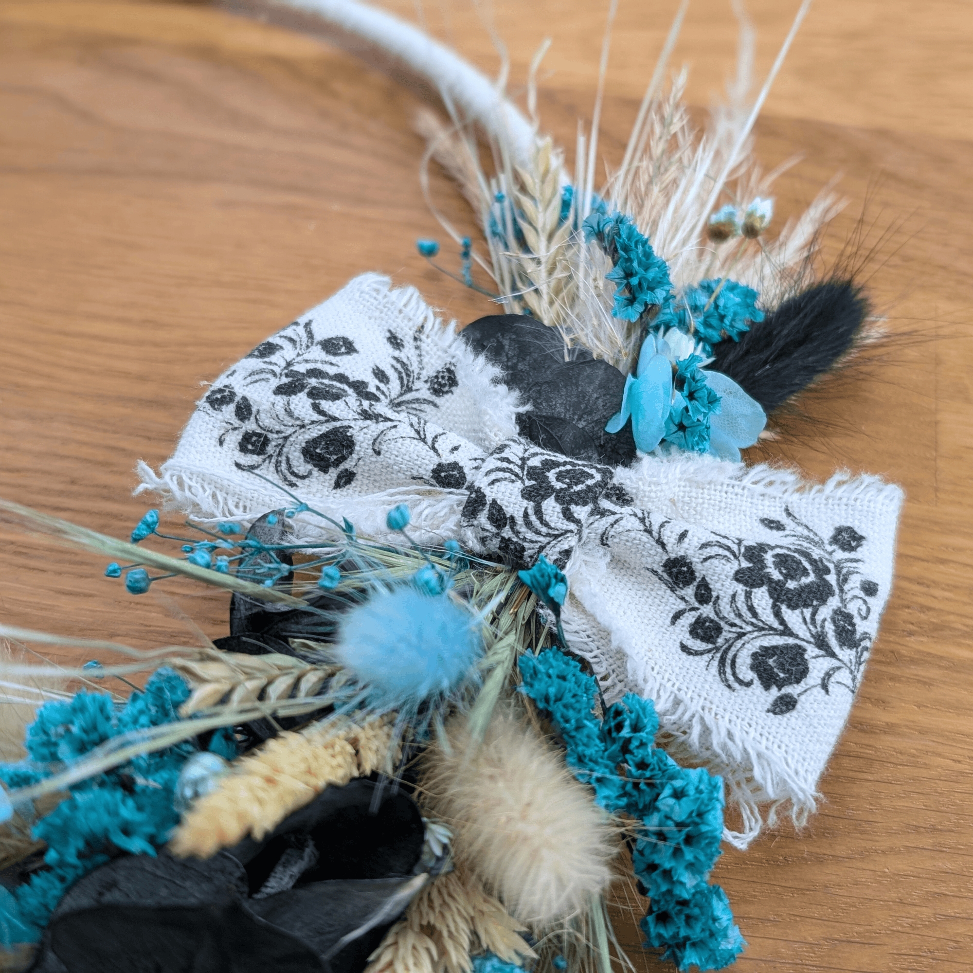 Dieser handgefertigte Trockenblumenkranz kombiniert florale Vielfalt mit einem modernen, weichen Makramee-Stil. Auf einem stabilen Drahtring gebunden und vollständig mit 100 % Baumwollband umwickelt, strahlt der Kranz eine ruhige, warme Eleganz aus. Die zusätzliche Baumwollschleife rundet das Design harmonisch ab.