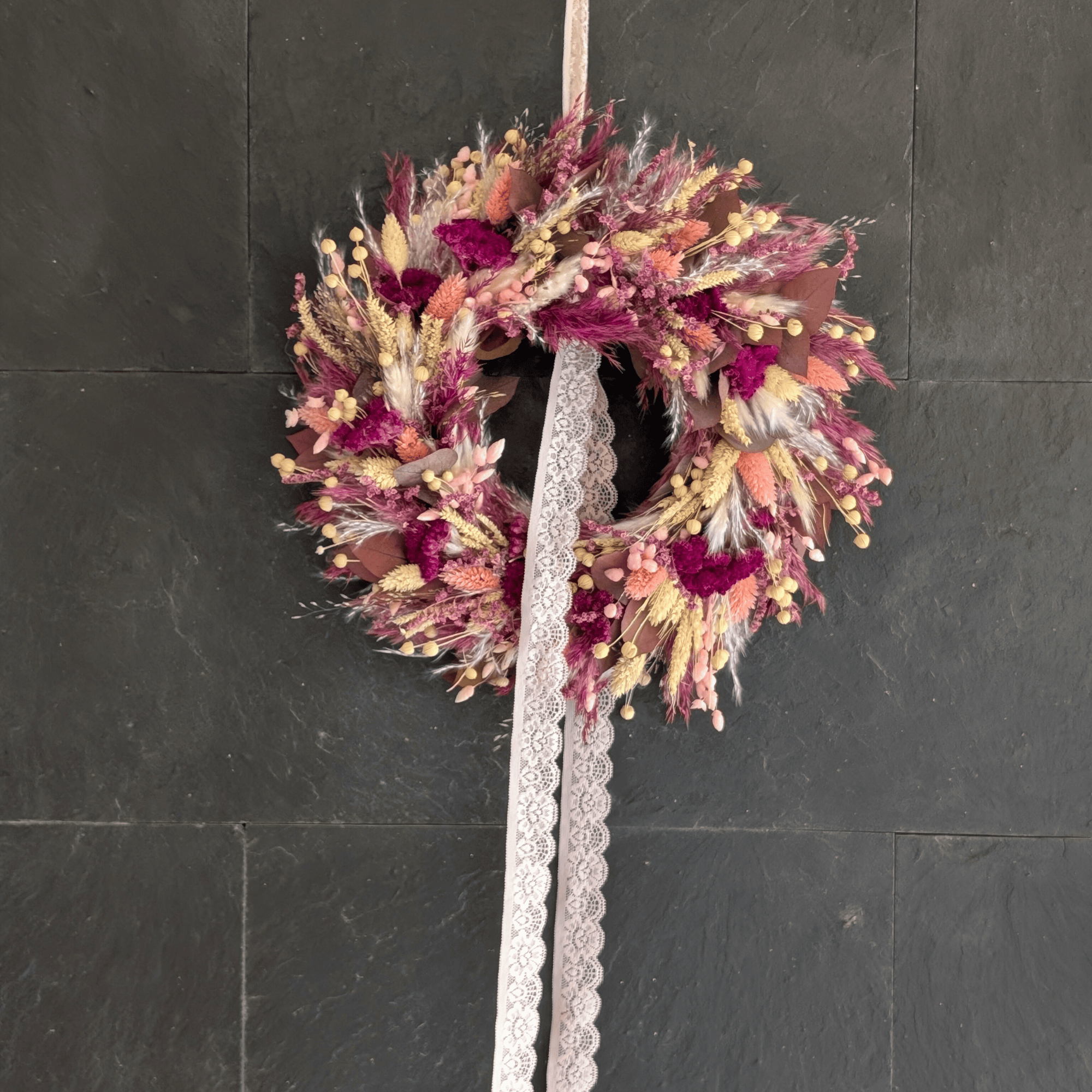 Trockenblumenkranz mit rosa Spitzenband – Zart. Natürlich. Handgemacht.