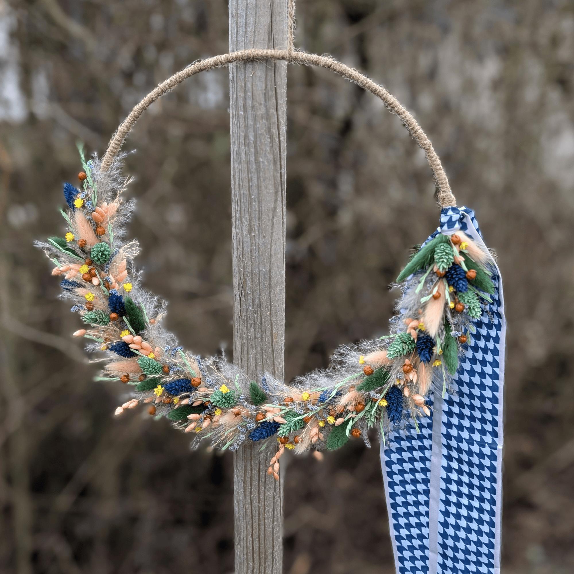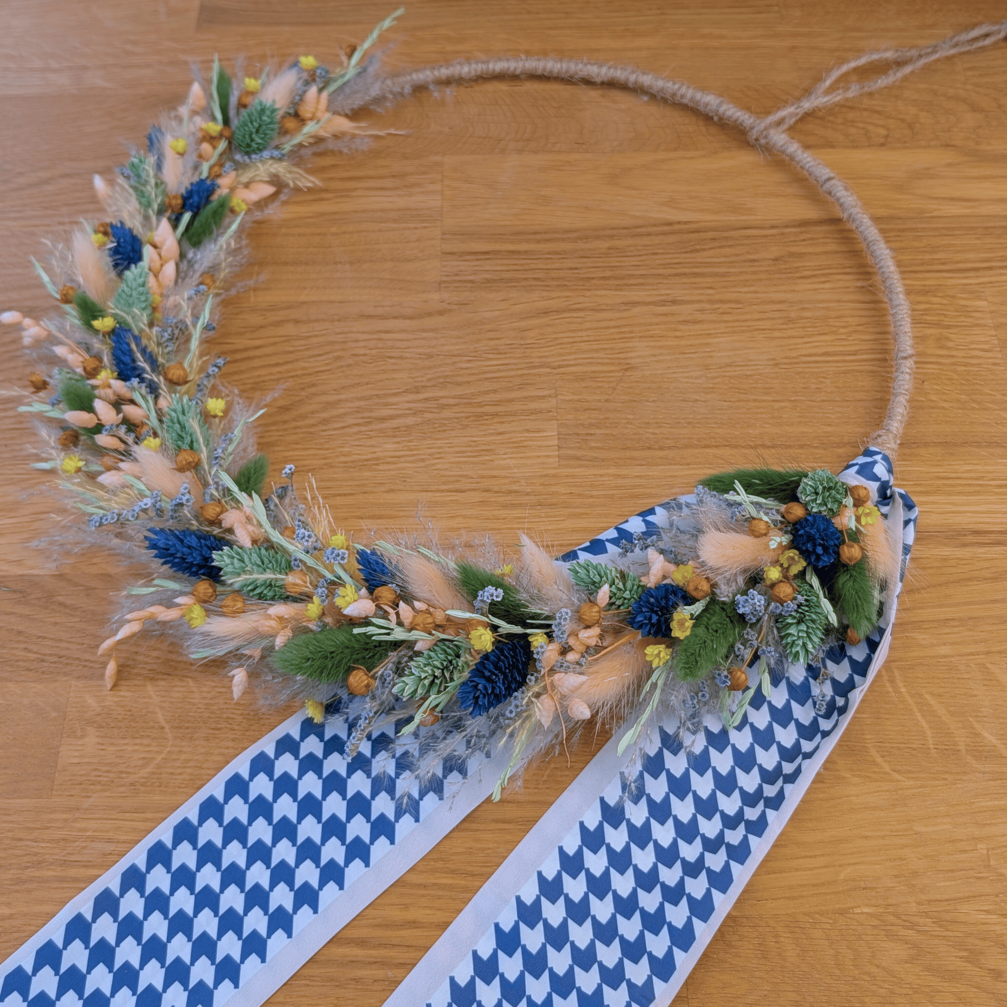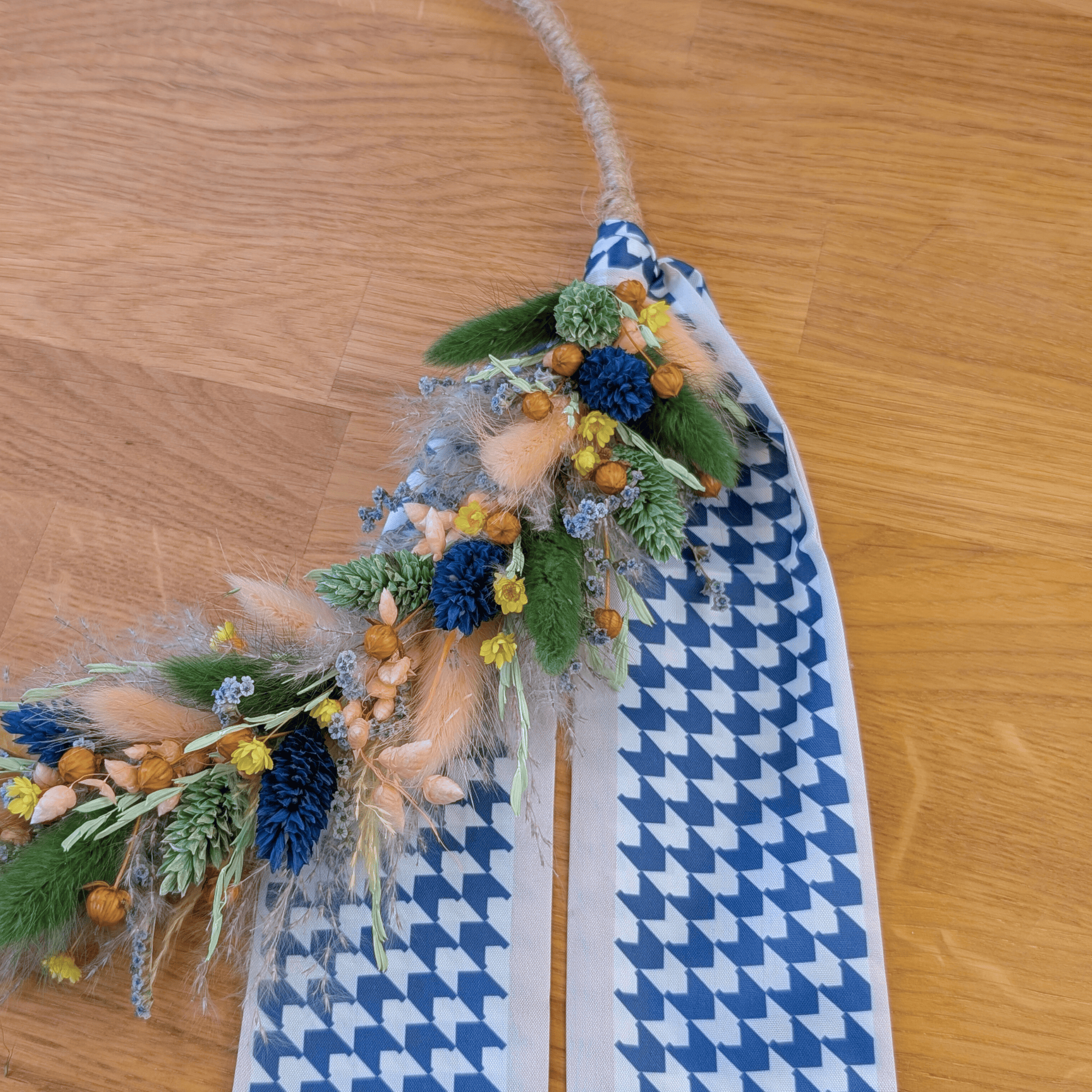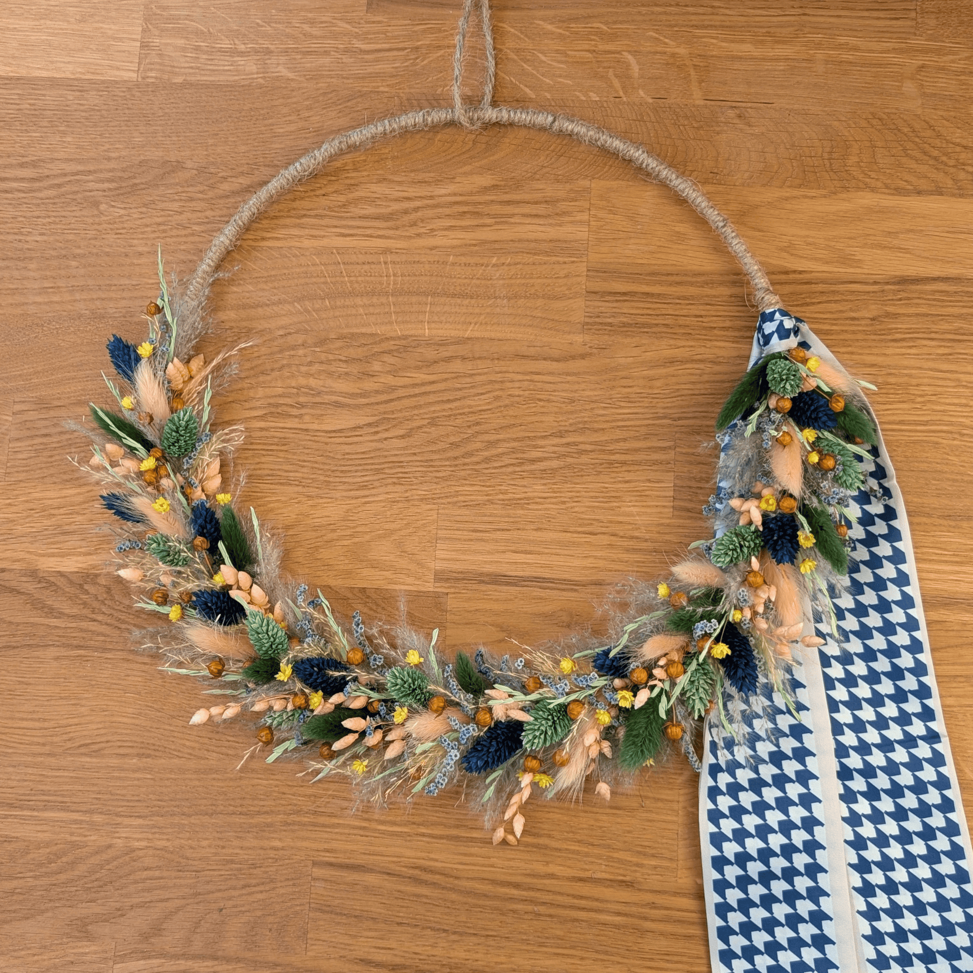 Einseitig gewickelter Trockenblumenkranz mit Seidenband