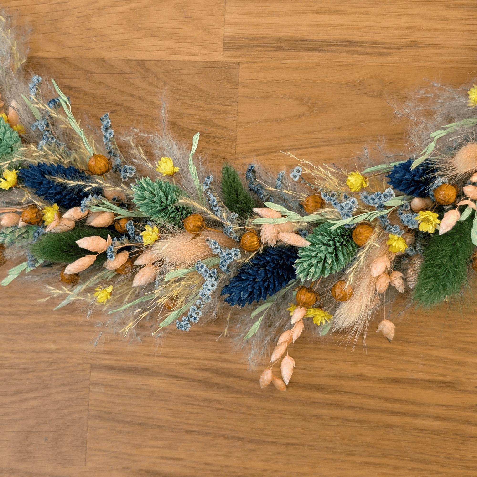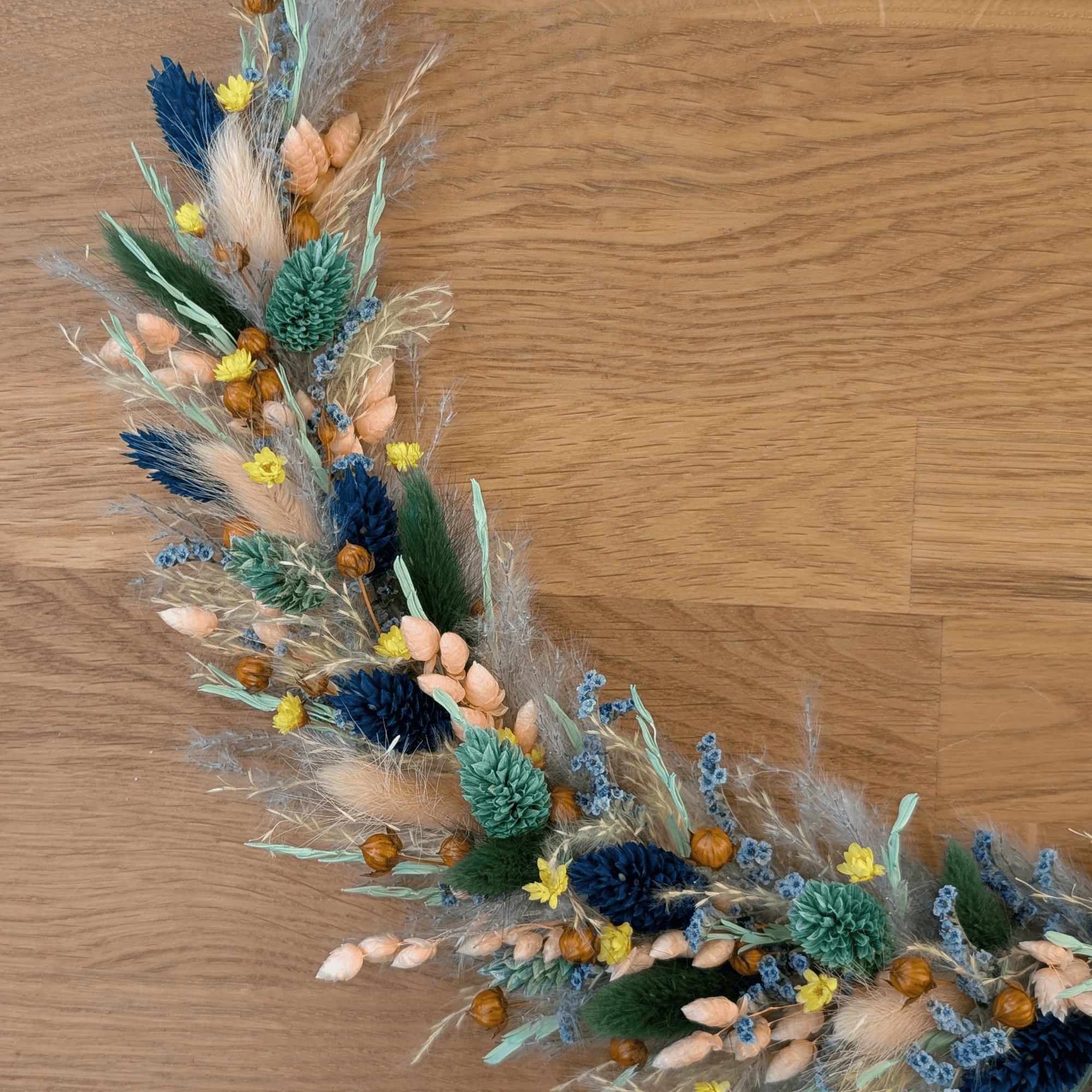 Dieser einseitig gewickelte Trockenblumenkranz verbindet natürliche Materialien mit einer harmonischen Farbwelt aus Blau, Grün, Beige, Gelb, Apricot, Orange und Weiß. Durch den mit Juteband umwickelten Drahtring und das feine Seidenband wirkt er zugleich rustikal, weich und stilvoll. So entsteht ein Kranz, der Wärme ausstrahlt und deinem Zuhause eine besondere, liebevoll gestaltete Note verleiht.