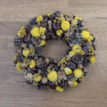 Die verschiedenen Naturmaterialien sorgen für spannende Kontraste: Rund trifft auf kantig, glatt auf rau. Leuchtendes Gelb von Graspedia und Goldköpfchen bringt Energie in die Komposition, während Rainfarn, Eicheln und Bucheckern für Bodenständigkeit und Waldgefühl sorgen. Mit 21 cm Durchmesser ist der Kranz klein, aber wirkungsvoll – perfekt für herbstliche Akzente in jeder Umgebung.
